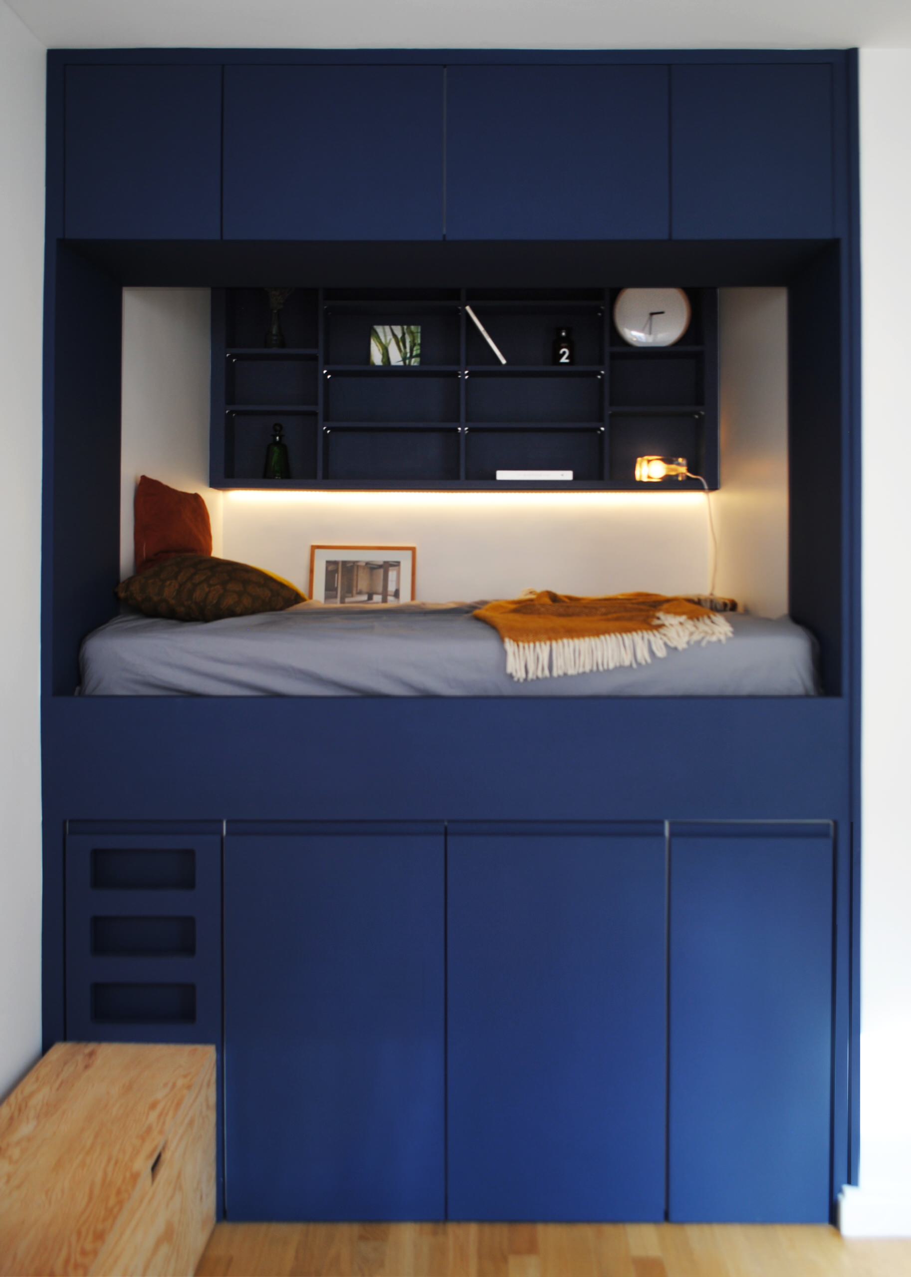 Le lit en hauteur cache toute une surface de rangement derrière l’échelle qui permet d’y accéder, ainsi qu’un placard sur mesure pour la machine à laver. Une tête de lit sert aussi à poser quelques livres et objets dans le coin nuit.
