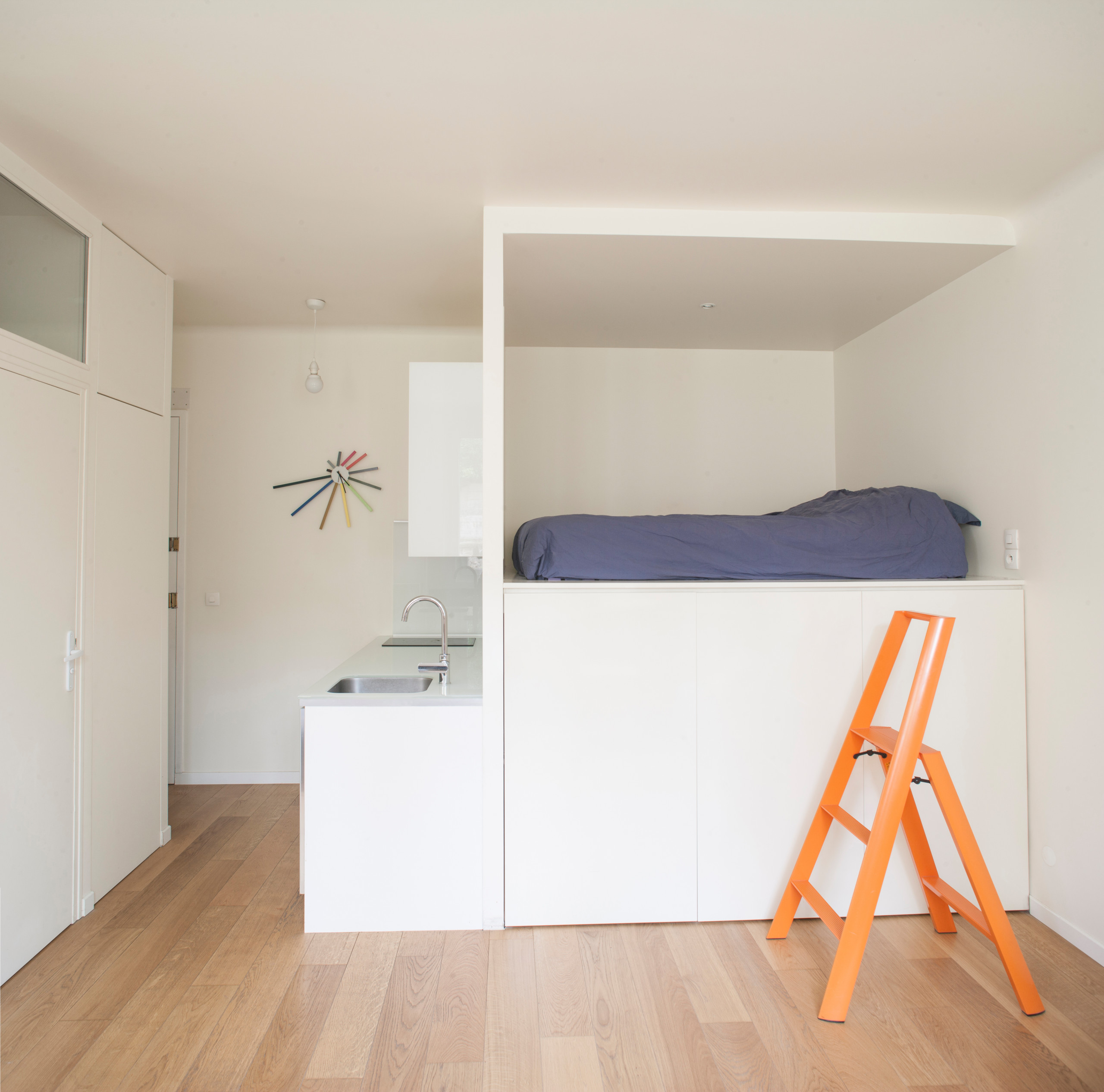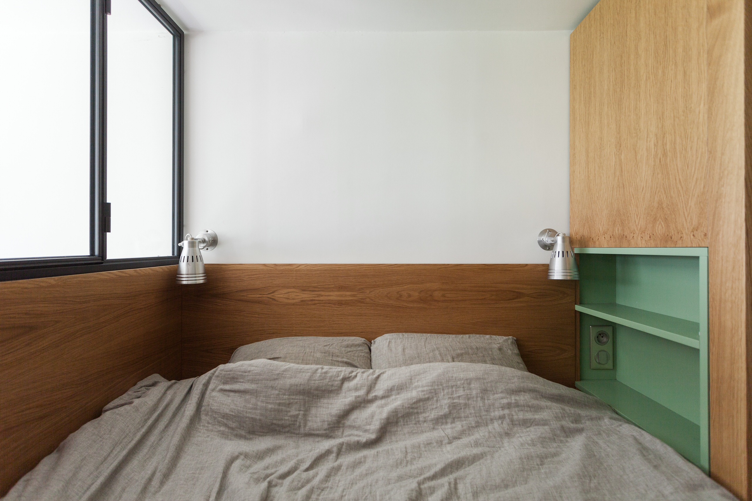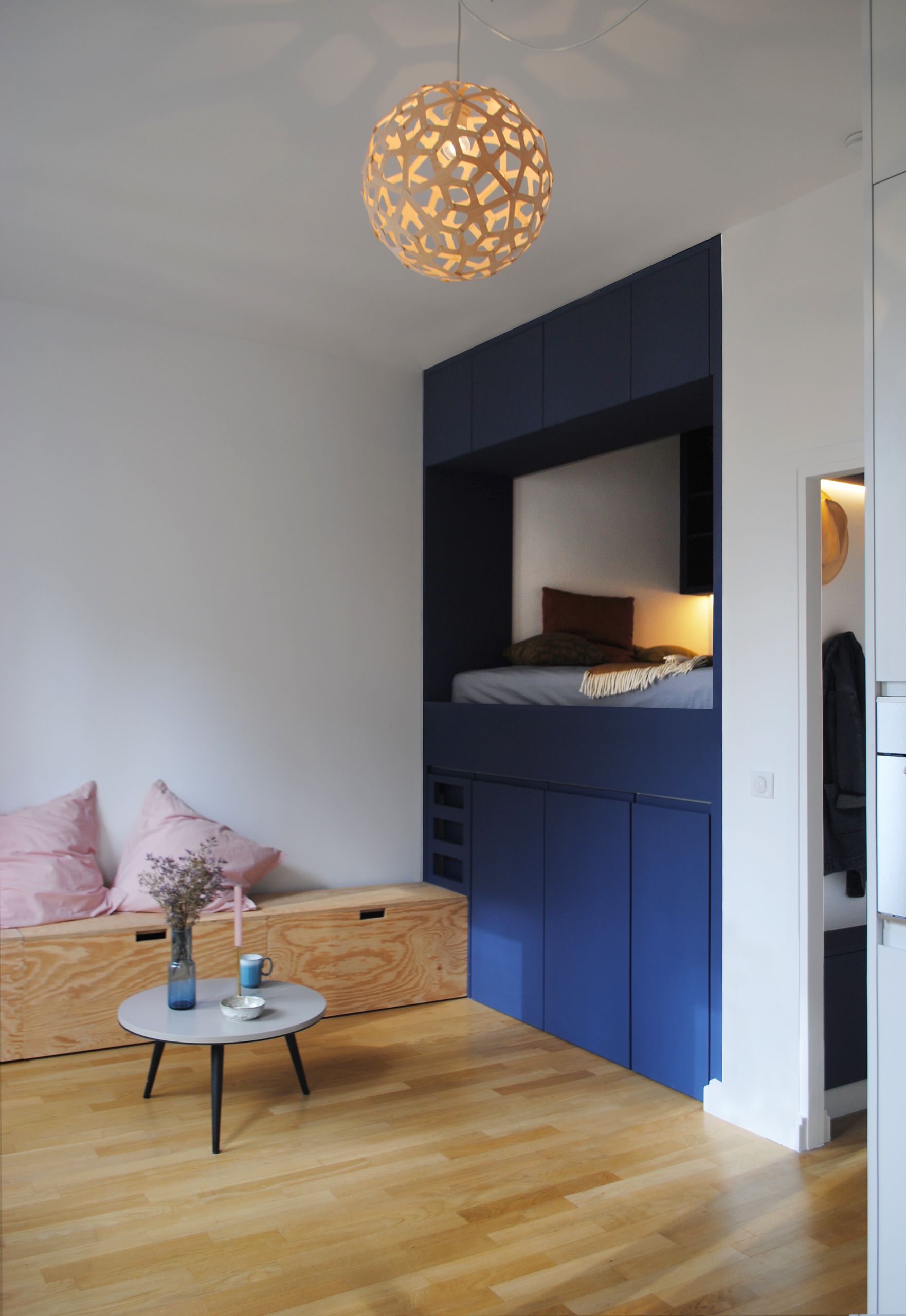 Laisser passer la lumière. Dans cet appartement de 20 m², les architectes Claire Arnaud et Philomène Delrue, de l’agence Arnaud & Delrue Architectes, ont séparé le coin chambre de la pièce de vie avec une cloison de 1,60 mètre de haut, qui laisse passer la lumière naturelle entre les deux zones.