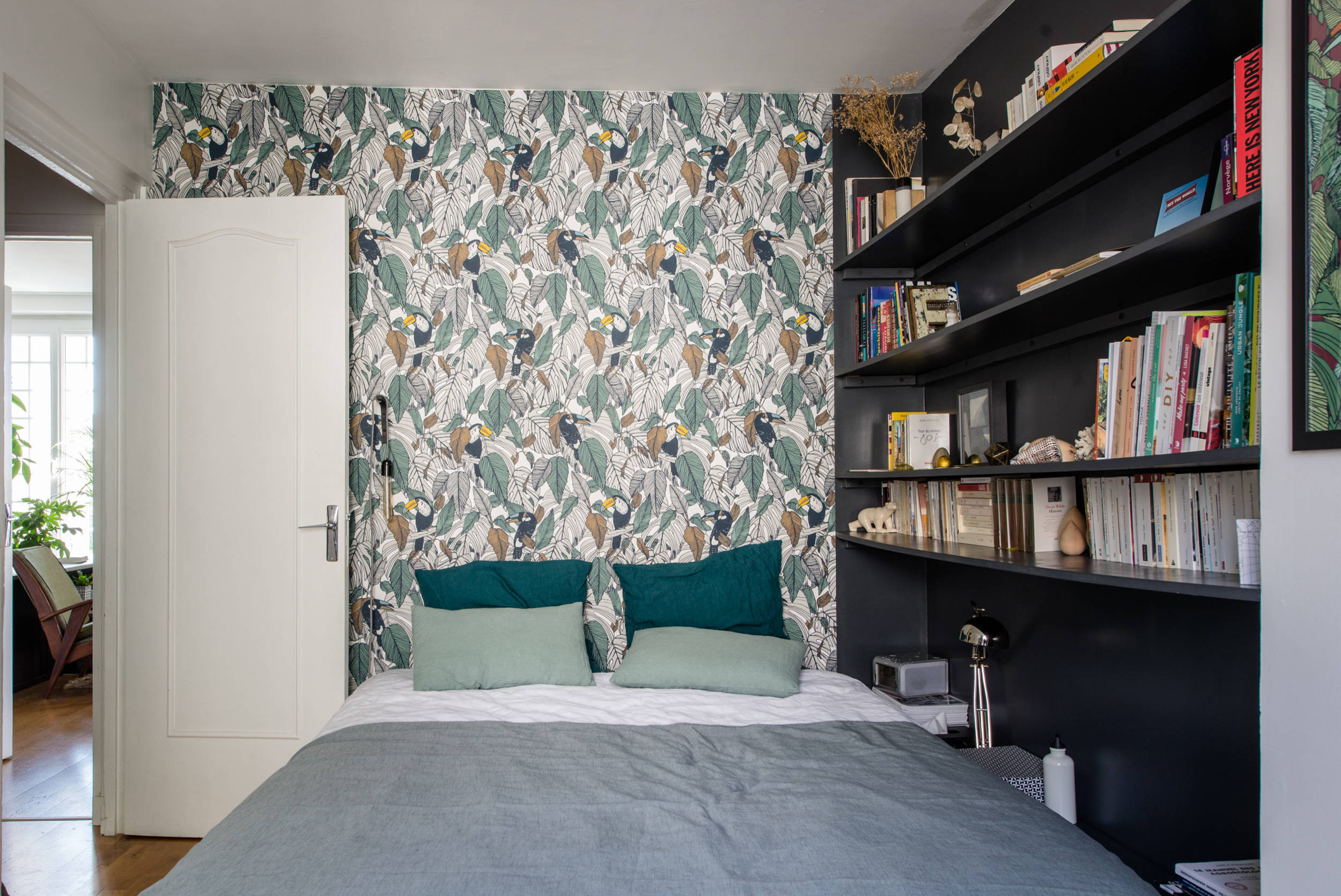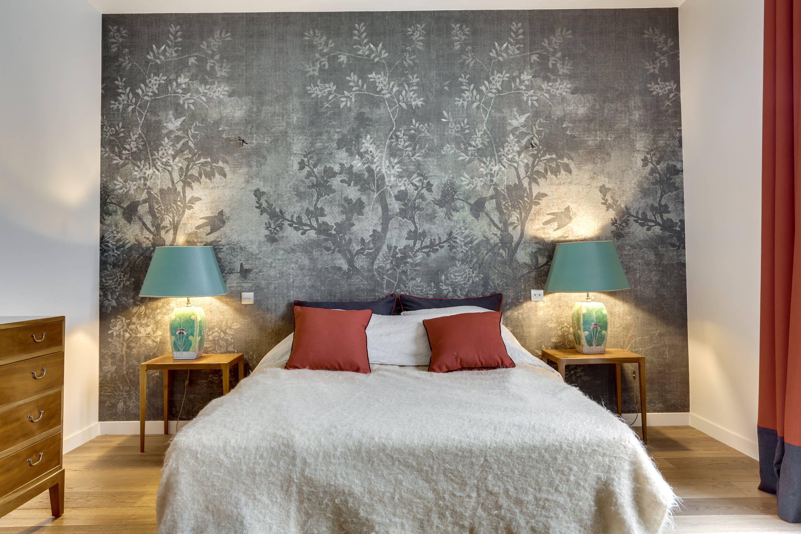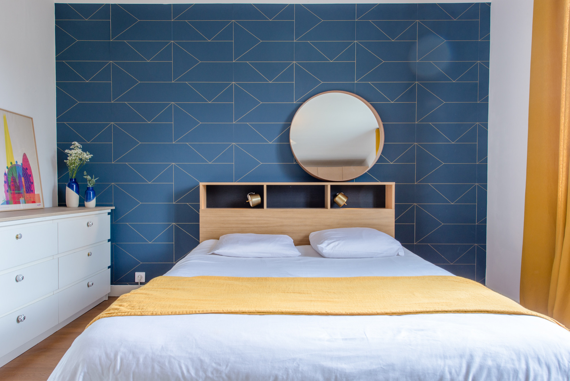 2. Un papier peint imitation estampes japonaises en tête de lit, comme une invitation au voyage.