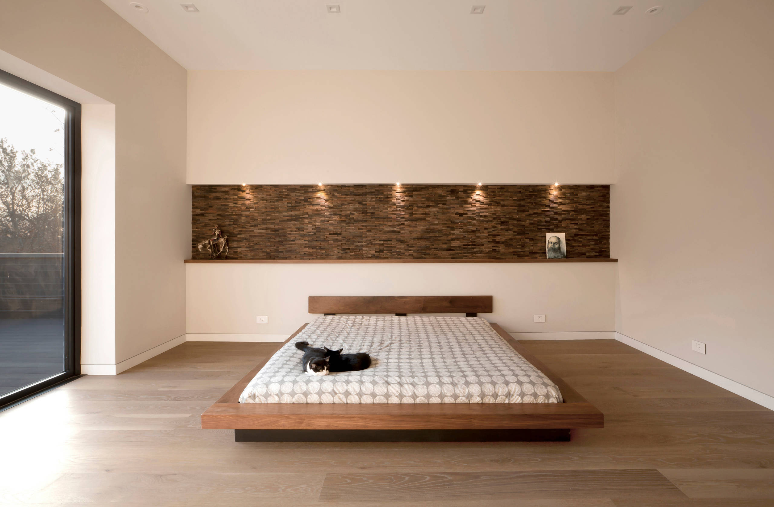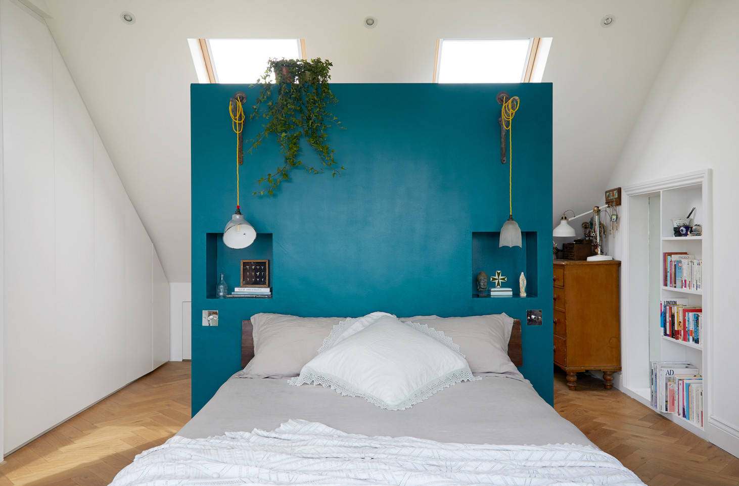28. Une tête de lit insérée dans une niche rassurante pour une sensation d’intimité renforcée.