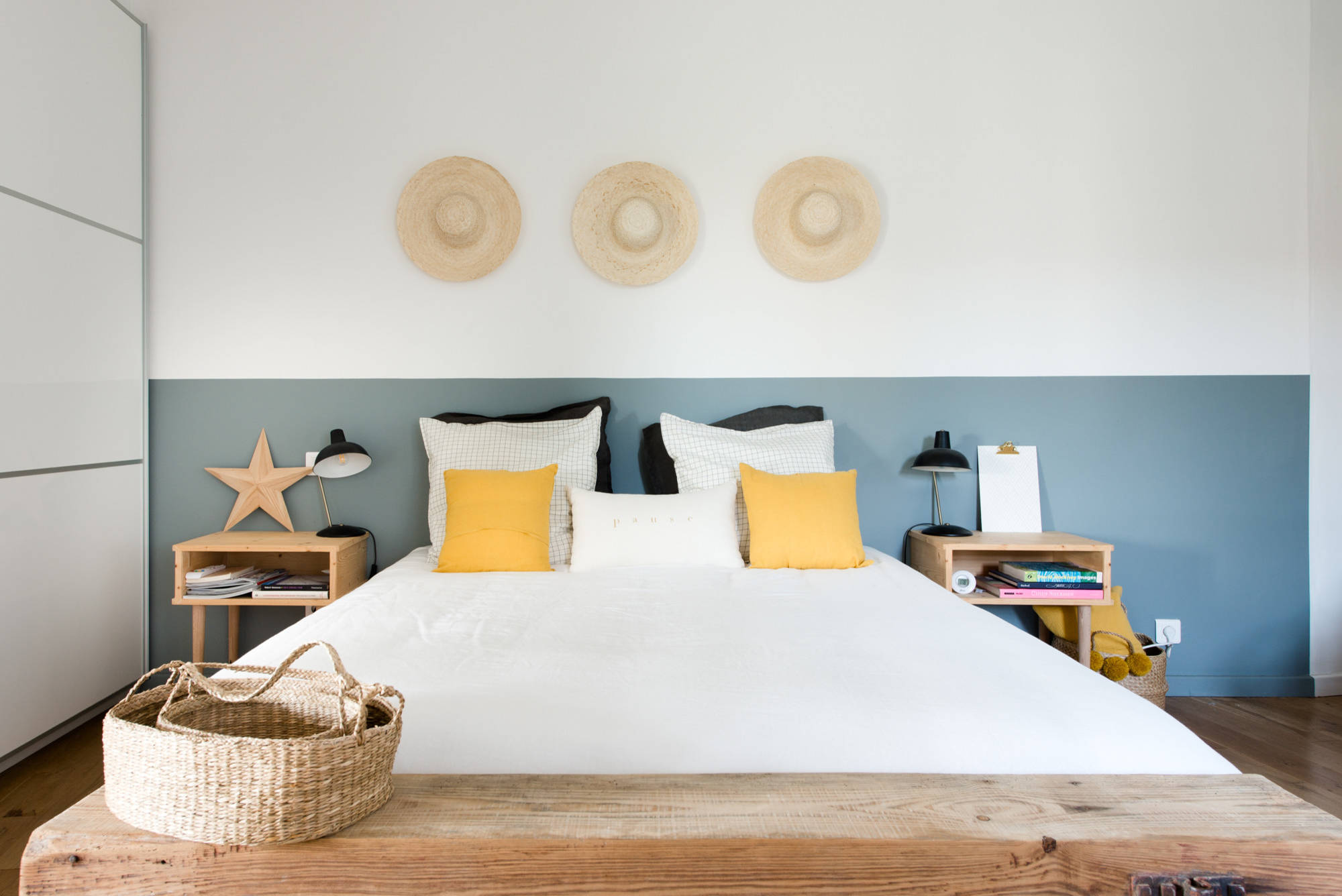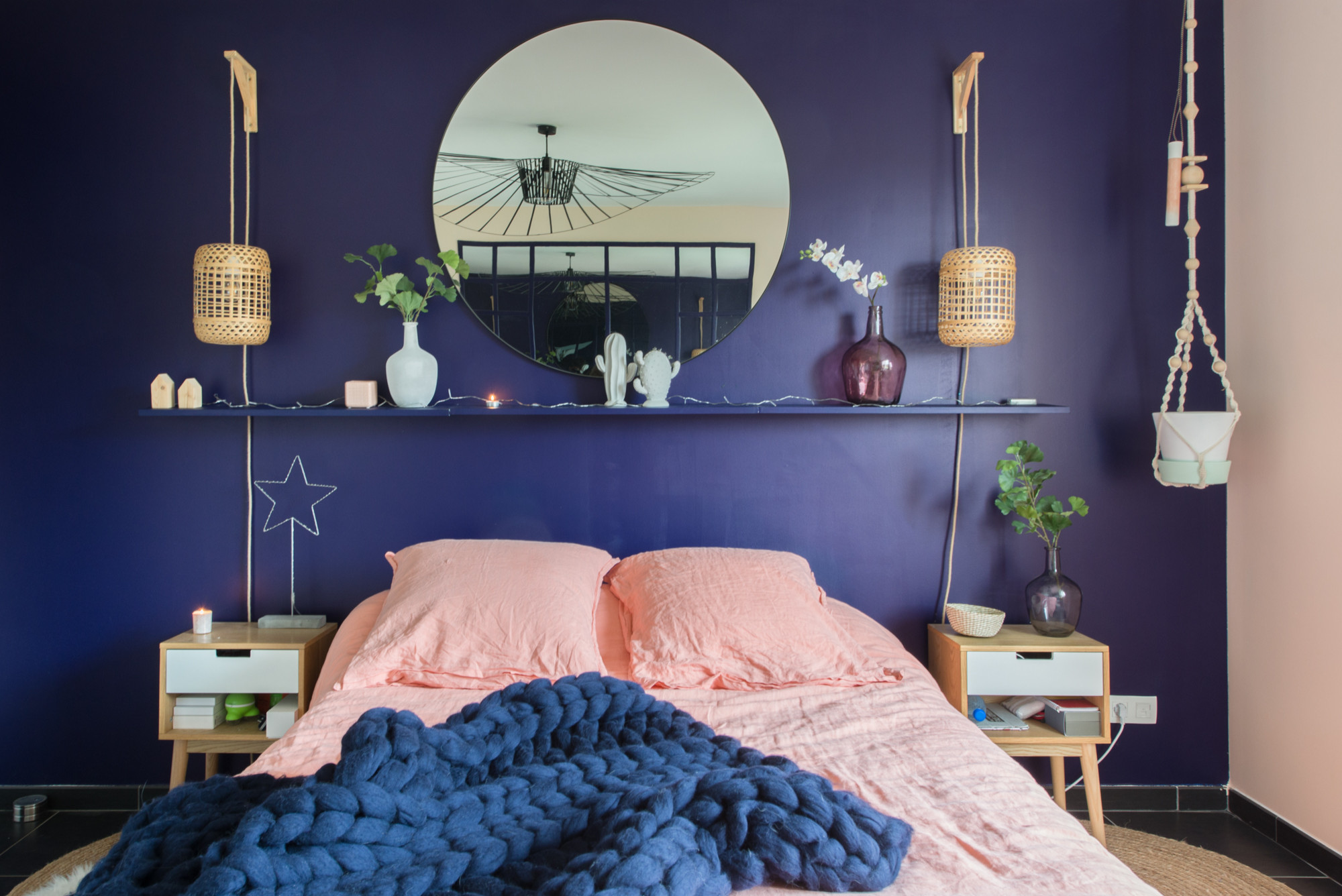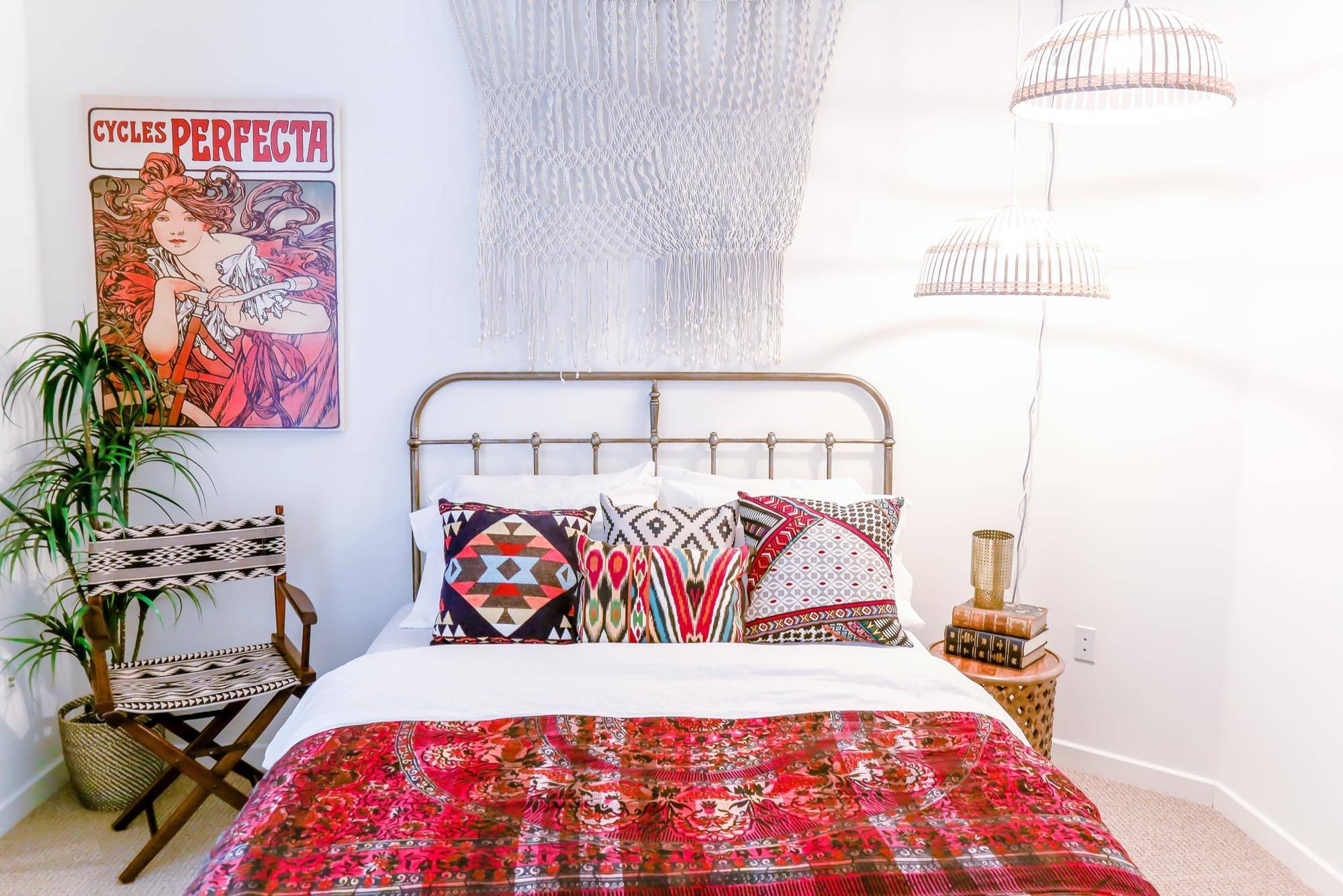 8. Une tête de lit tressée et un papier peint végétal pour une décoration bohème et colorée qui donne envie de rester couché.