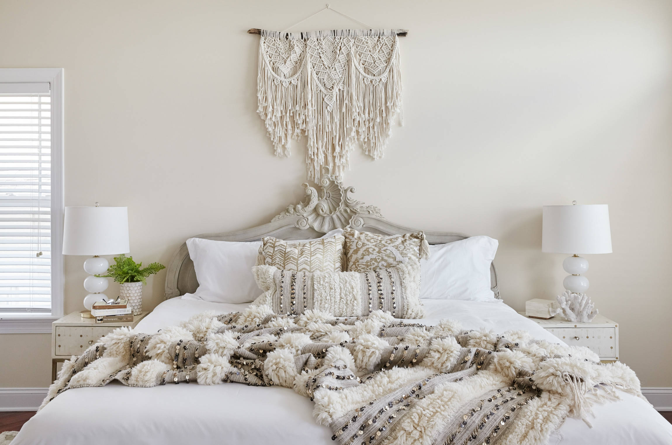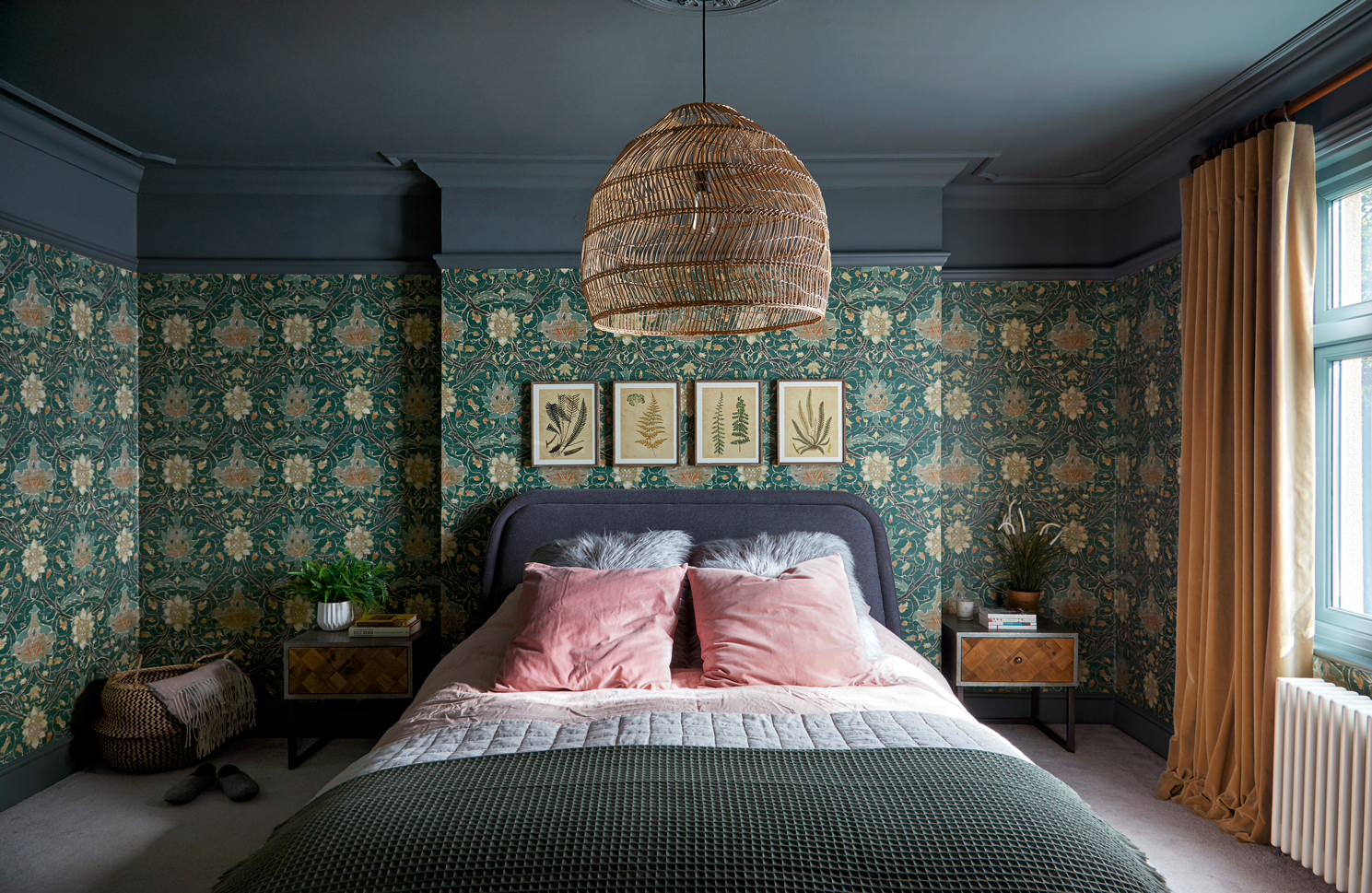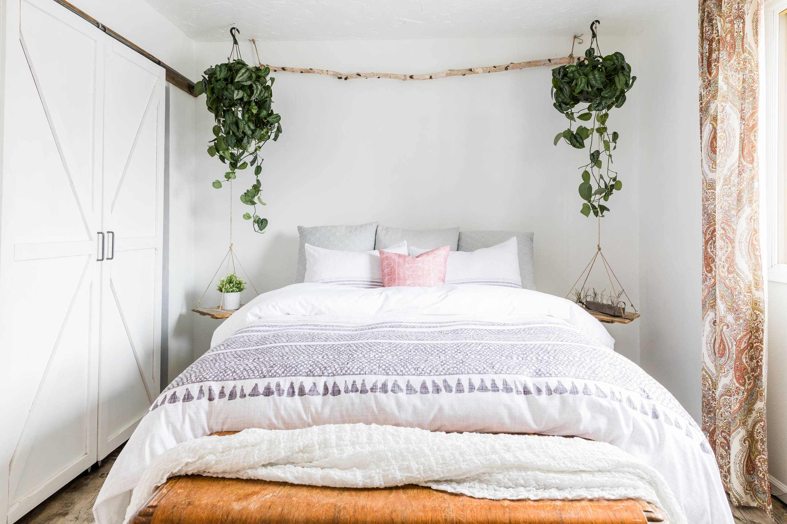 8. Une tête de lit tressée et un papier peint végétal pour une décoration bohème et colorée qui donne envie de rester couché.