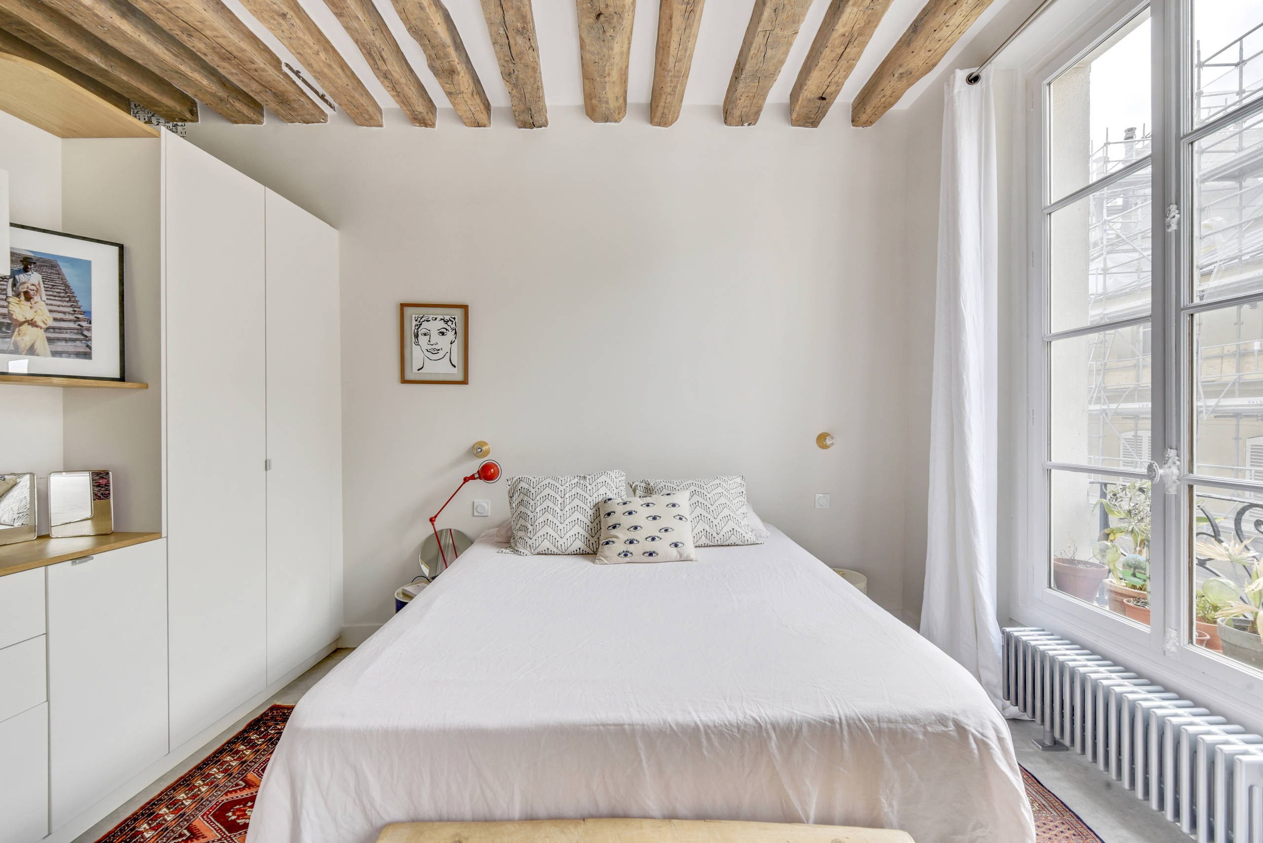 29. Des poutres laissées apparentes au plafond pour pouvoir admirer les charmes d’un appartement ancien depuis le lit.