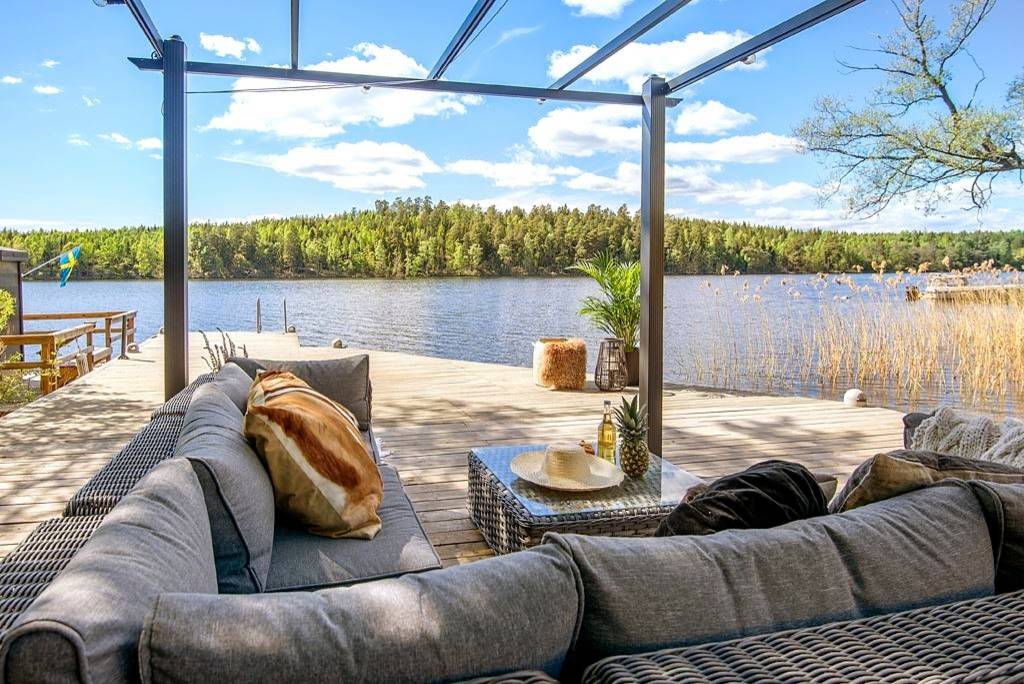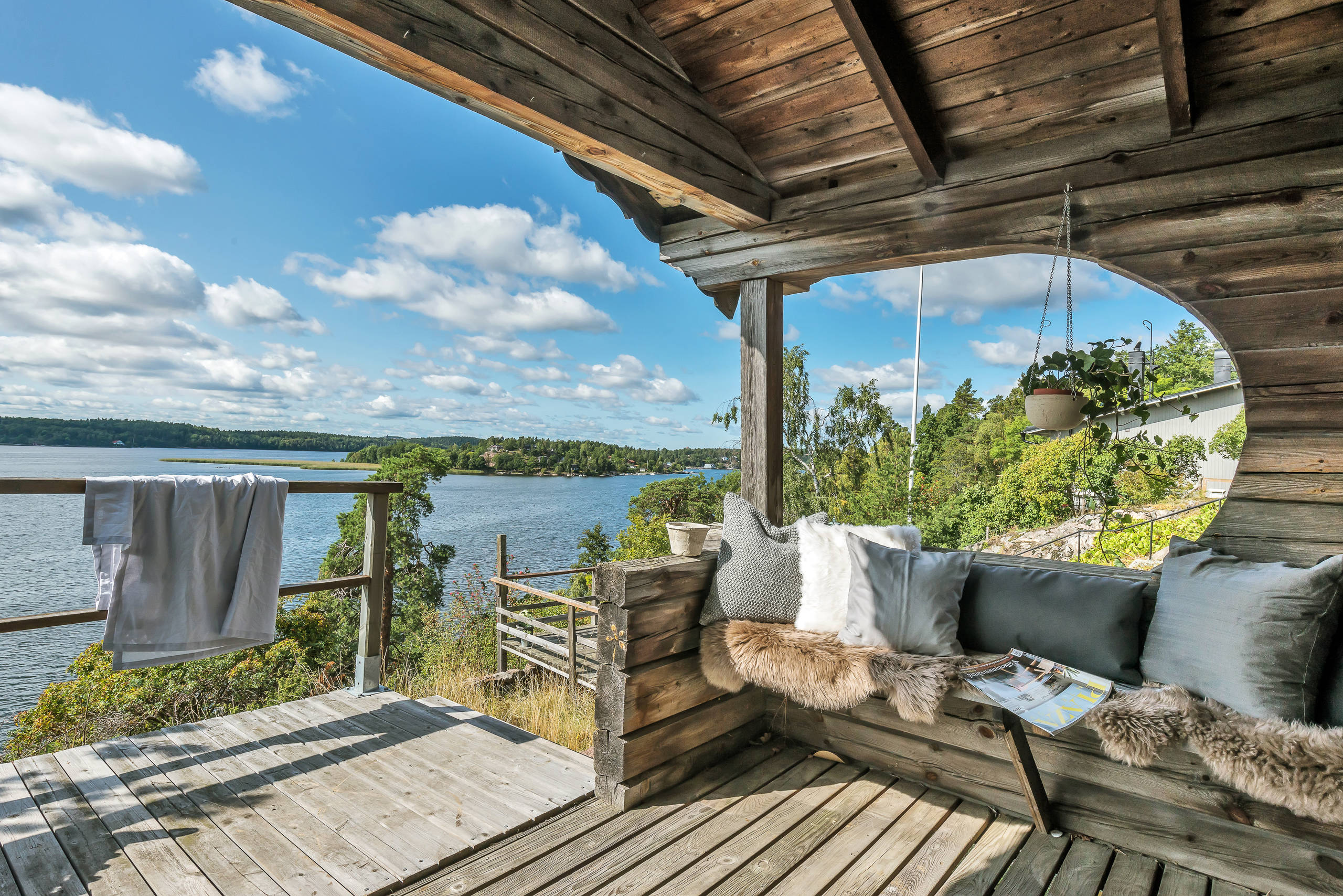 53. Réchauffée de coussin et fausses fourrures pour profiter de la vue sur le lac, en Suède.