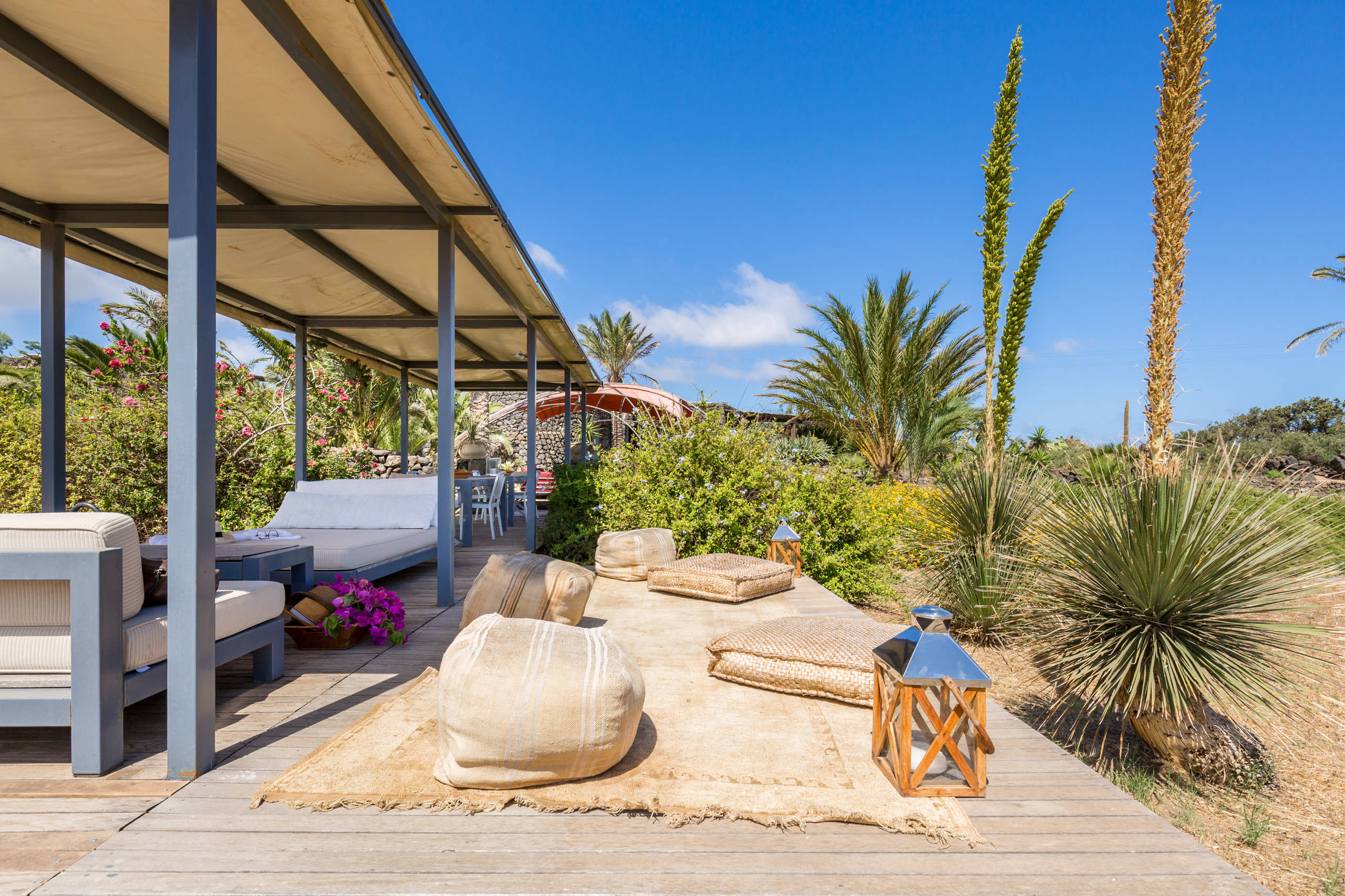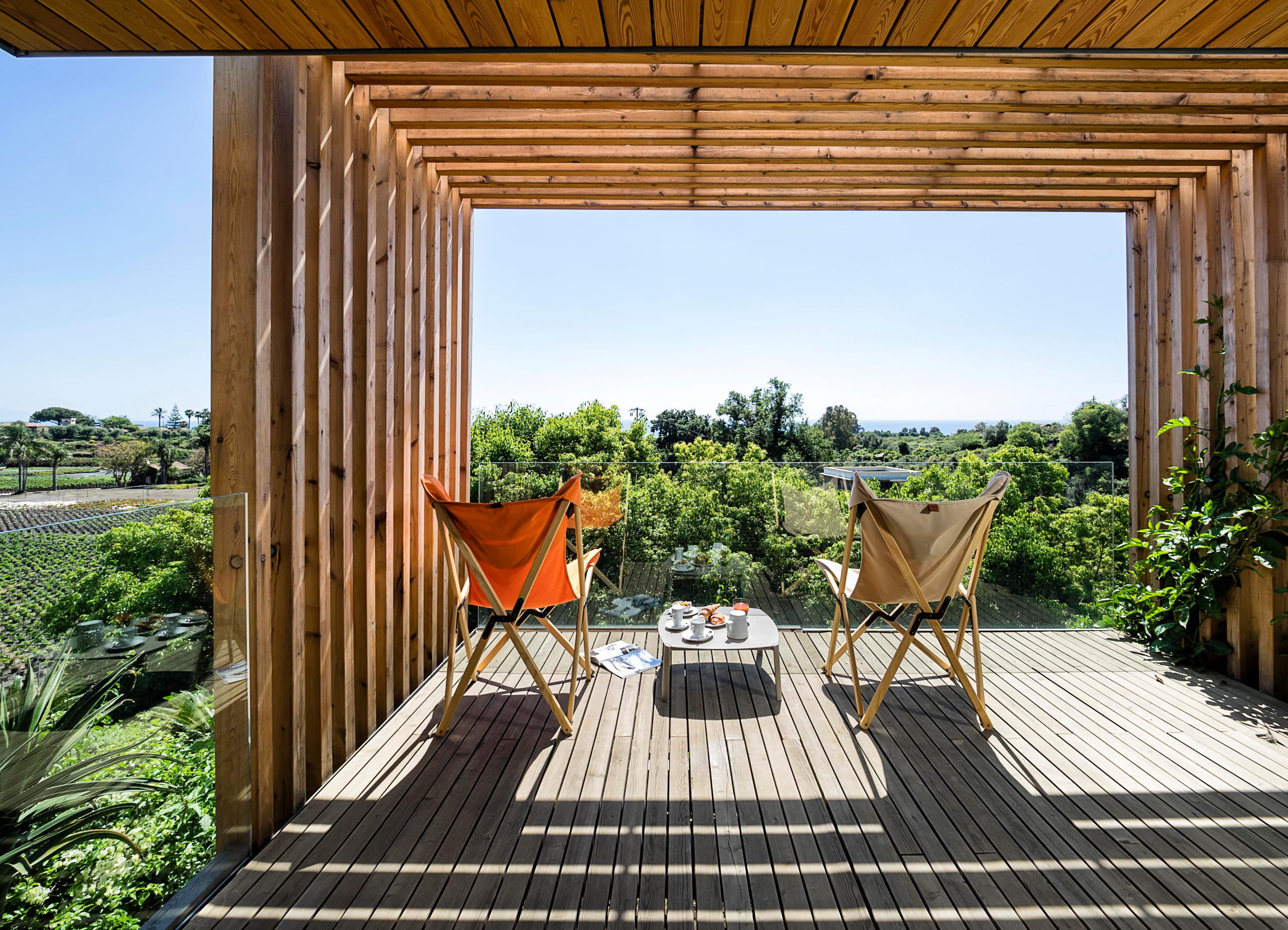 50. À l’ombre d’une pergola contemporaine et avec un garde-corps transparent pour profiter de la vue sur la région de Palerme, en Italie.