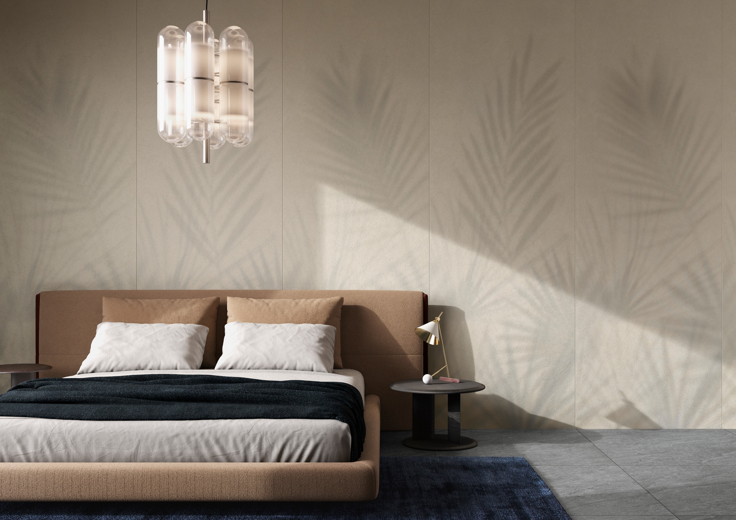 Laminam, fabricant italien de grès porcelainé de grand format, a lancé sa série twO de dalles ultrafines de 2 millimètres. Cette finesse permet des applications à plat et en courbe, notamment sur les murs, les armoires, les appareils électroménagers et les meubles. La série comprend le style Flora Luce, que l’on voit ici comme revêtement mural. Le design présente un motif de silhouettes botaniques ombragées.