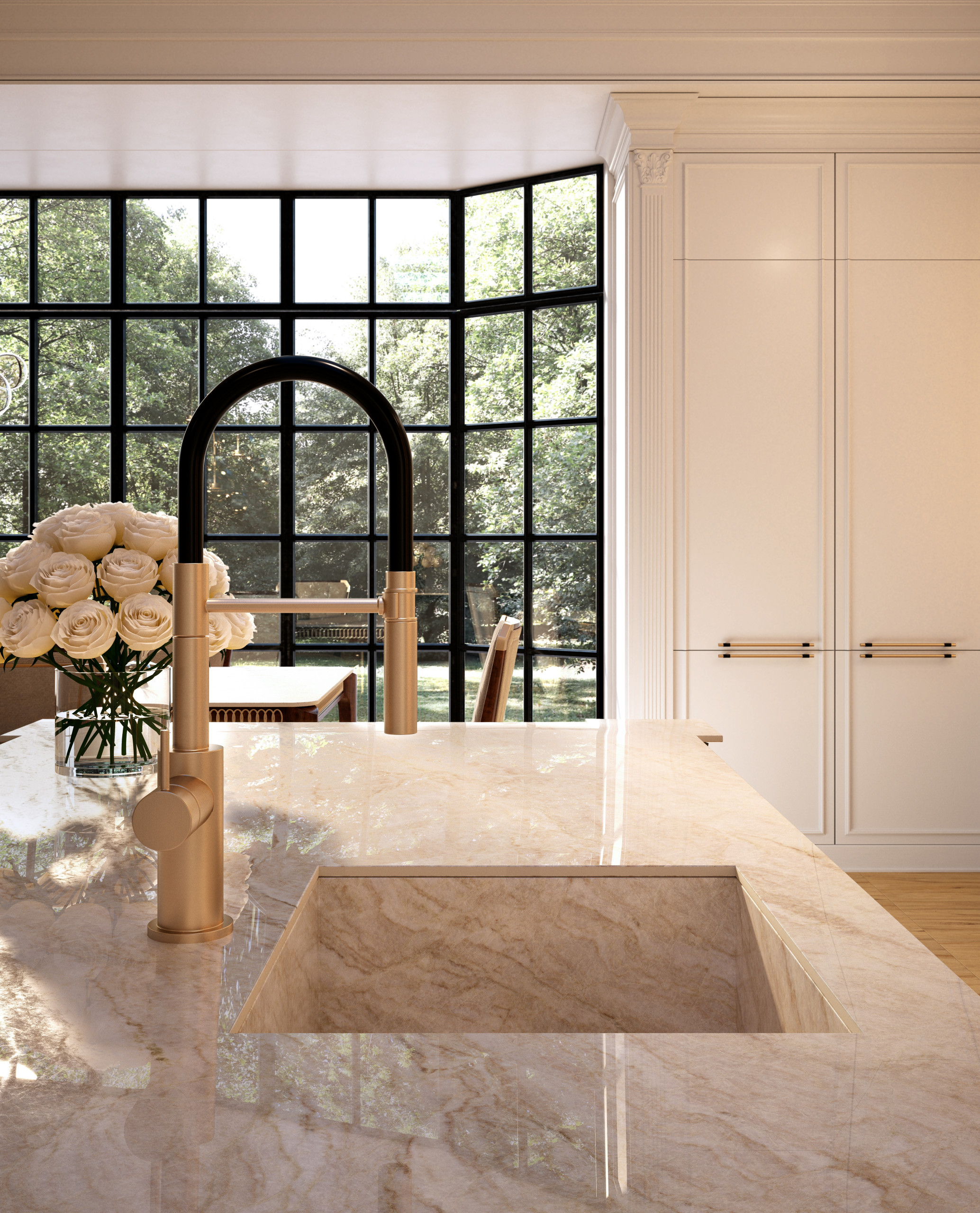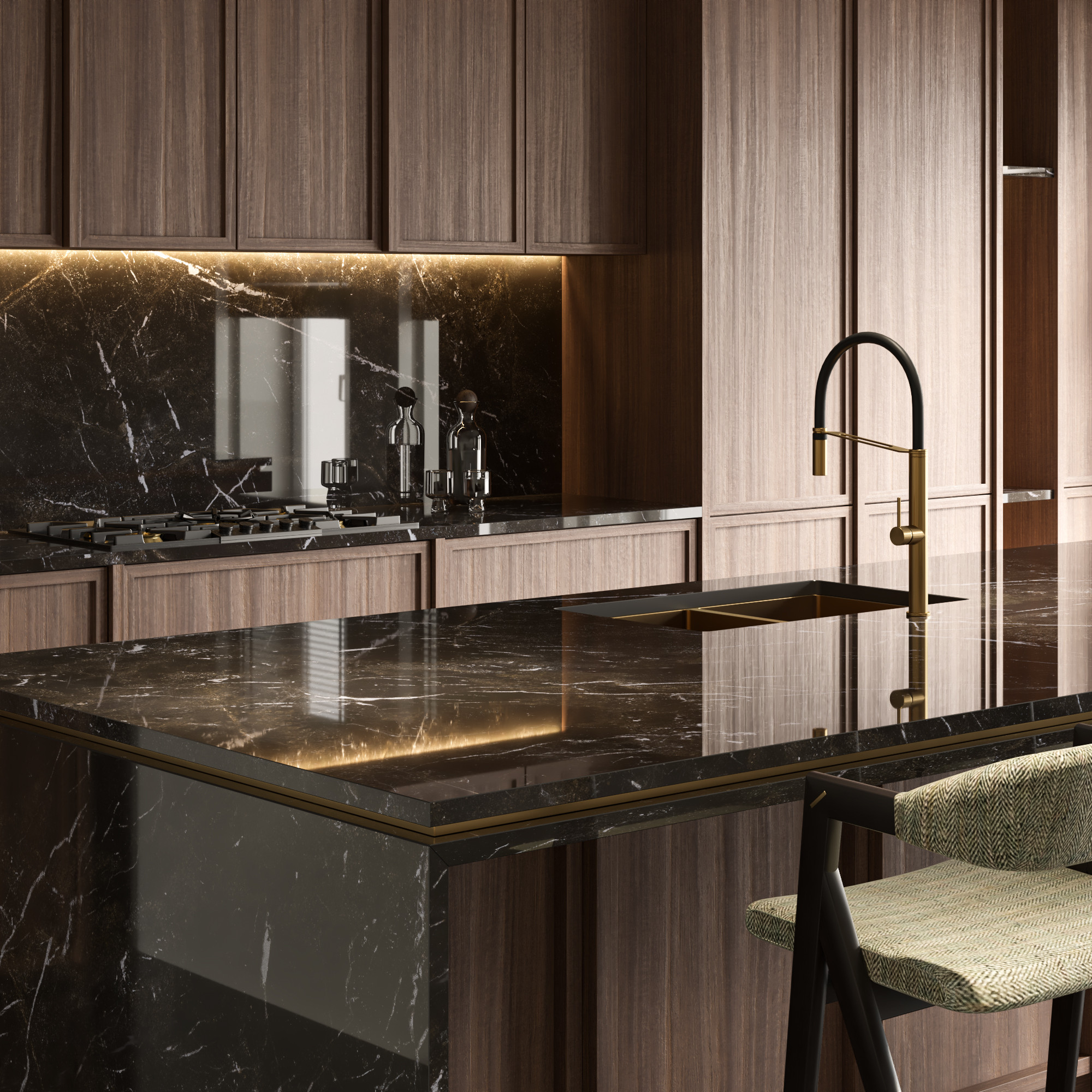 Les tons clairs et chauds restent populaires pour les plans de travail, mais les teintes sombres continuent d’attirer l’attention. Cambria a lancé deux nouvelles couleurs sombres. Remington Brass, que l’on voit ici sur le contour de la cheminée, se caractérise par des bruns chauds, un charbon de bois profond et des veines d’alliage cuivrées.