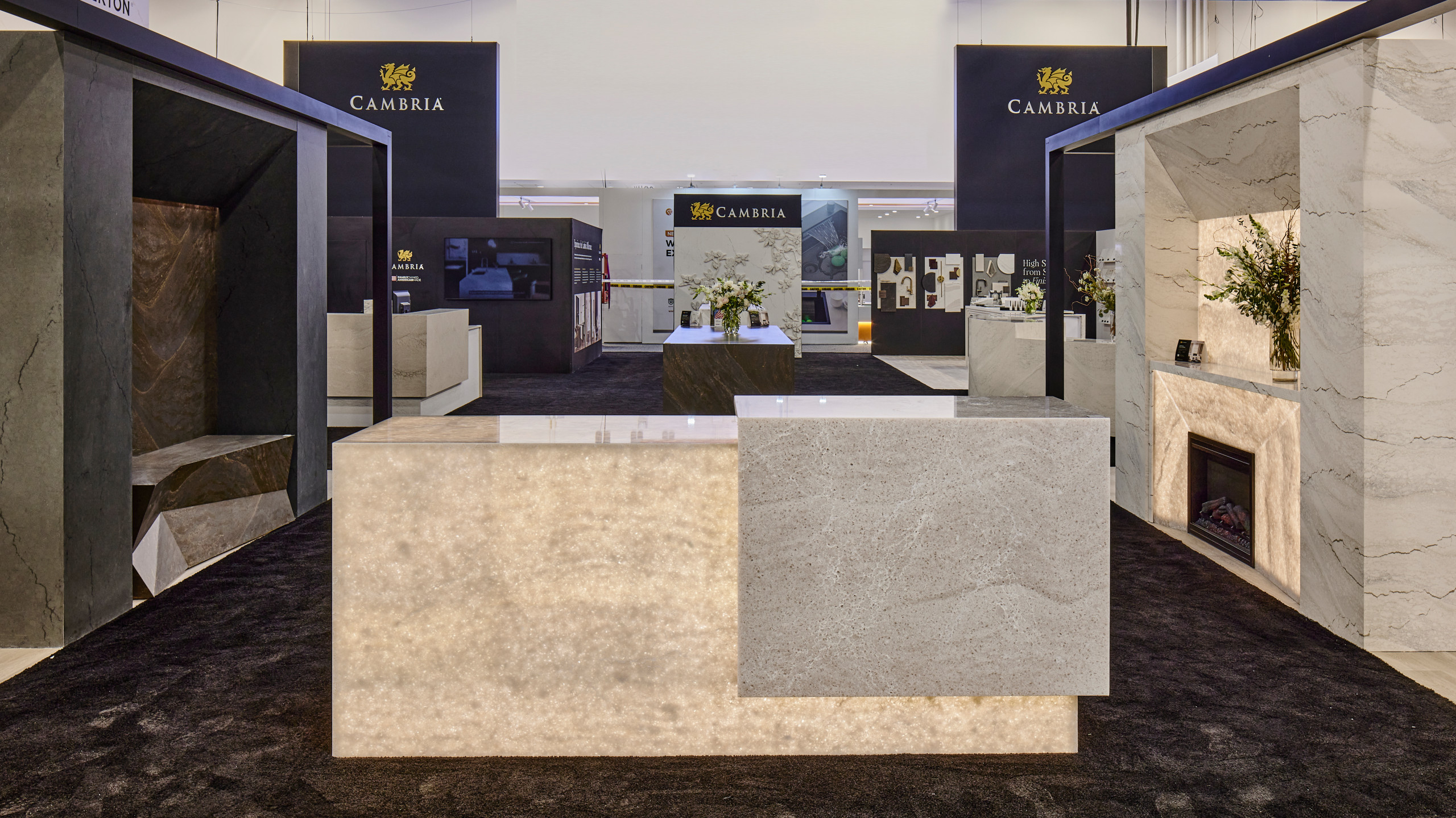Cambria a présenté le nouveau style Brighton sur son stand KBIS, illustré ici, en montrant comment il peut être rétroéclairé pour créer un îlot de cuisine luminescent ou un entourage de cheminée. Un représentant de Cambria a déclaré qu’un professionnel de l’habitat s’était arrêté sur le stand pour demander s’il était possible d’utiliser des dalles rétroéclairées pour les murs d’une douche et d’en faire le seul éclairage.