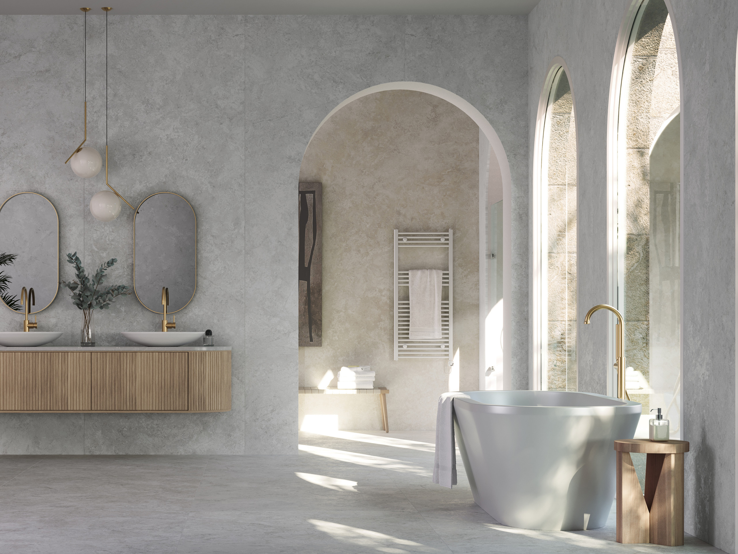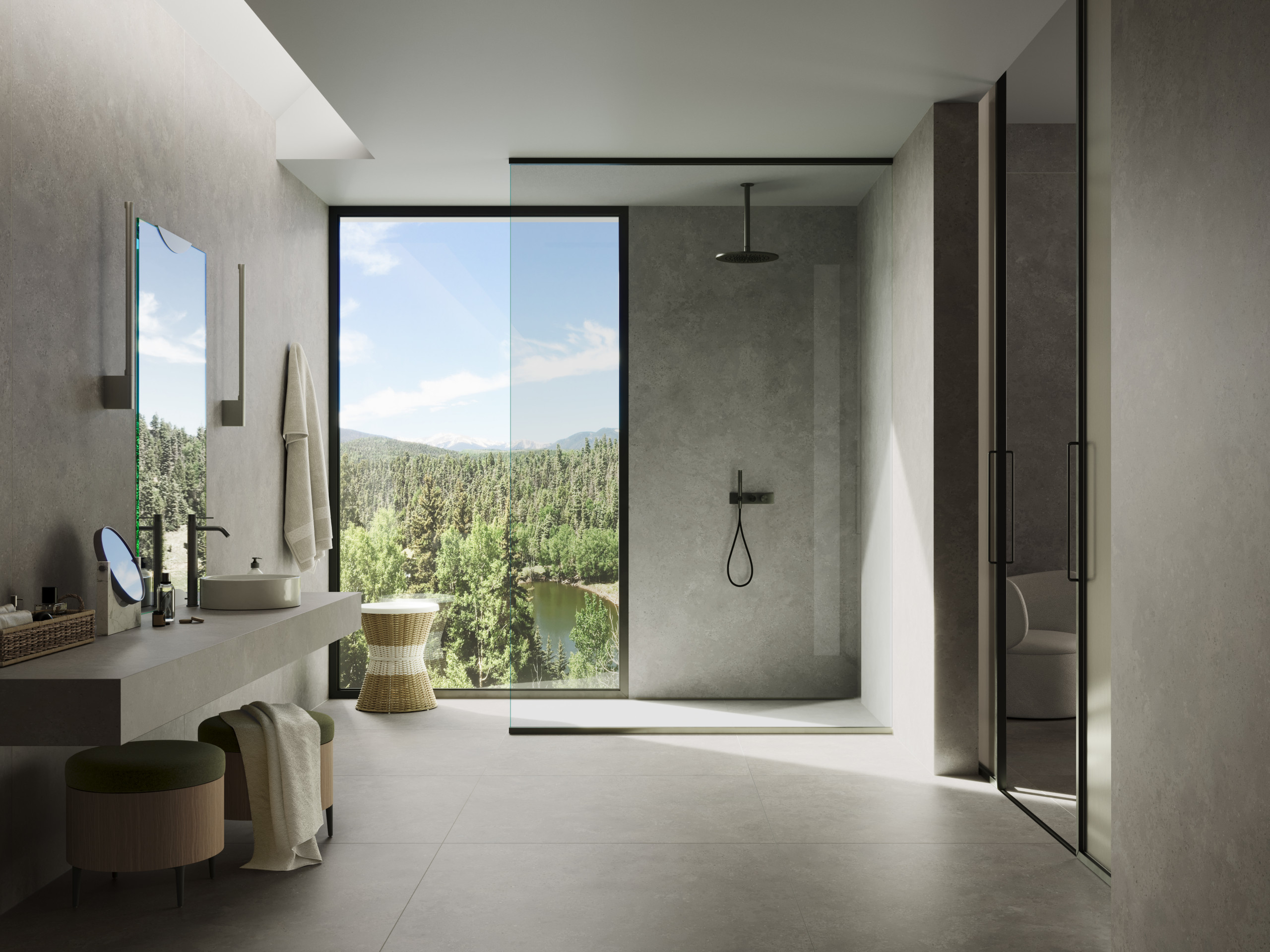 La pierre frittée Neolith est un matériau à faible teneur en silice et est recyclable à 100 %. Certains modèles contiennent jusqu’à 98 % de matériaux recyclés. Sa production est également respectueuse de l’environnement. Toutes les eaux industrielles sont recyclées, précise Neolith, 100 % de l’énergie électrique utilisée pendant le processus de production provient de sources garanties d’origine renouvelable, et l’entreprise recycle plus de 96 % des déchets industriels générés. Le nouveau style WhiteSands de Neolith est présenté ici comme revêtement mural et de sol.