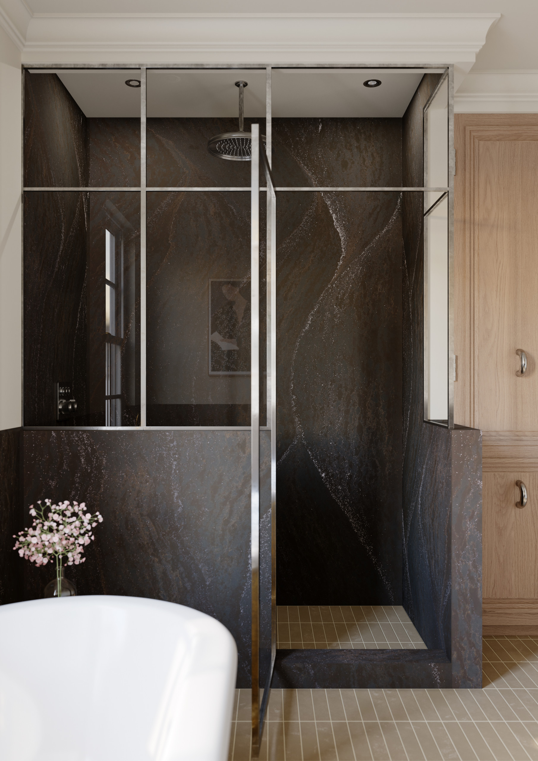 Le nouveau quartz Berkshire Satin Ridge de Cambria, qui présente des veines texturées semblables à celles du métal, est utilisé sur toutes les surfaces de cette salle de bains, à l’exception du plafond.