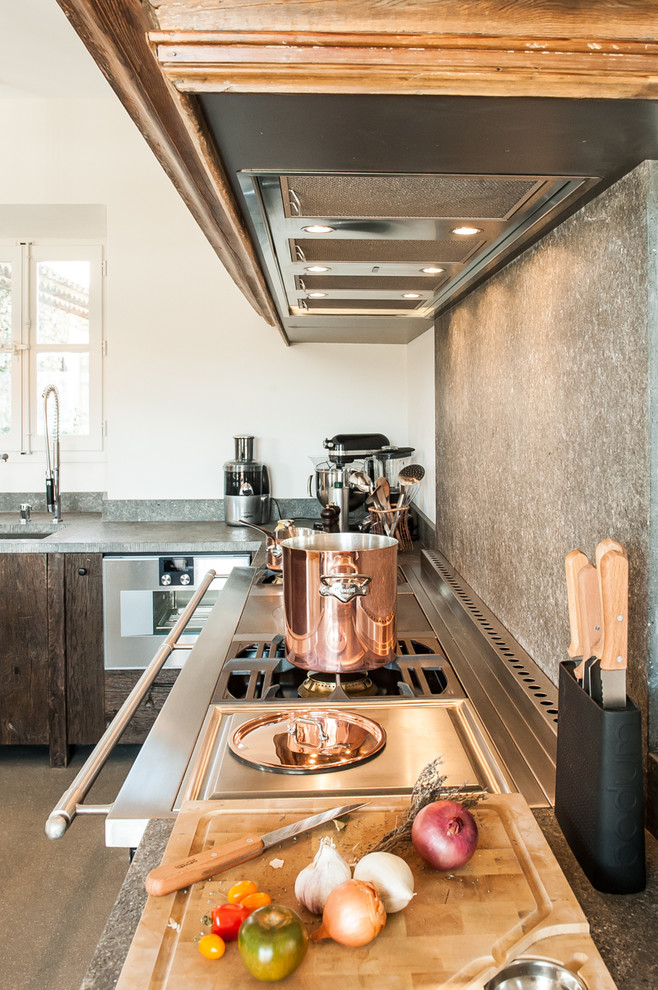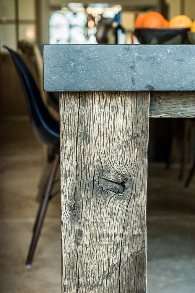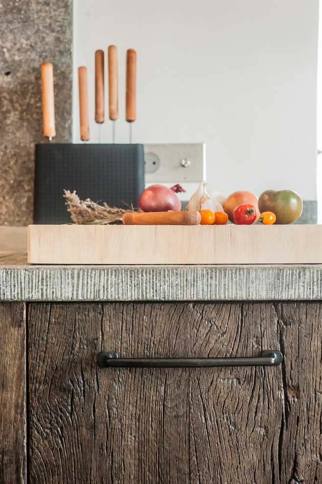 Réalisée à partir de volets anciens, de pierre de Bourgogne ou de zinc, cette cuisine à l’aspect brut mêle douceur et force de caractère, à l’image de sa propriétaire.