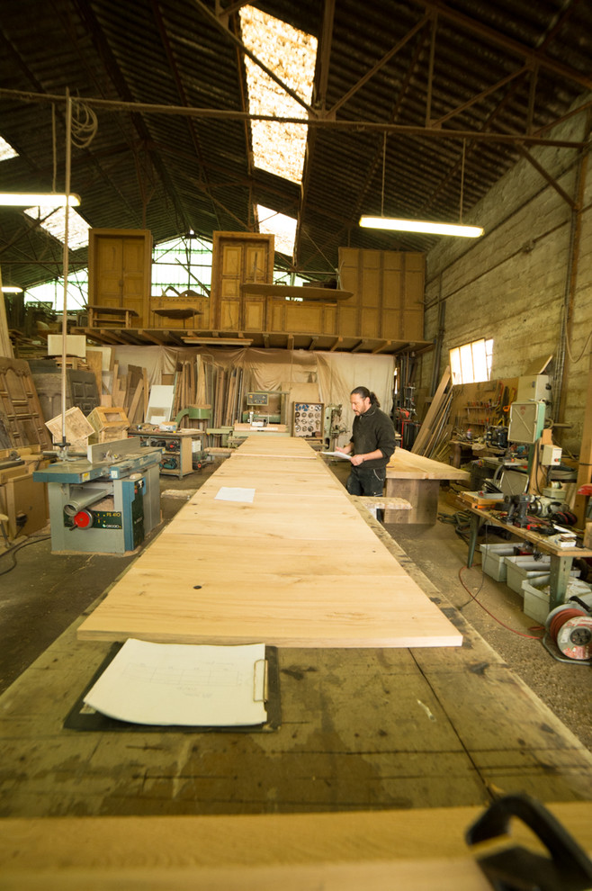 Je travaille actuellement sur une vaste cuisine dans le Var, en bord de mer. Ce projet, réalisé en collaboration avec la décoratrice Amélie Vigneron, a été élaboré à l’aide de planches à wagons brutes peintes d’une couleur blanche pour apporter un maximum de luminosité.