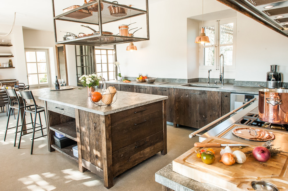 Dans cette bâtisse située à deux pas de Nîmes, nous avons mêlé chêne ancien et lignes épurées, avec un plan de travail réalisé en pierre reconstituée pour créer une cuisine au look ultracontemporain.
