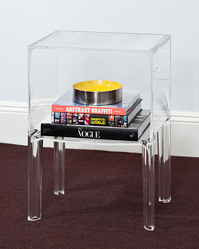 C’est parce qu’il n’arrivait pas à trouver une table de nuit à la mesure de ses (hautes) aspirations que Starck a imaginé ce petit meuble fantôme, dont la quasi-invisibilité évoque, non sans humour, toutes les tables de nuit que le designer a croisées mais n’a pas su voir dans sa vie.