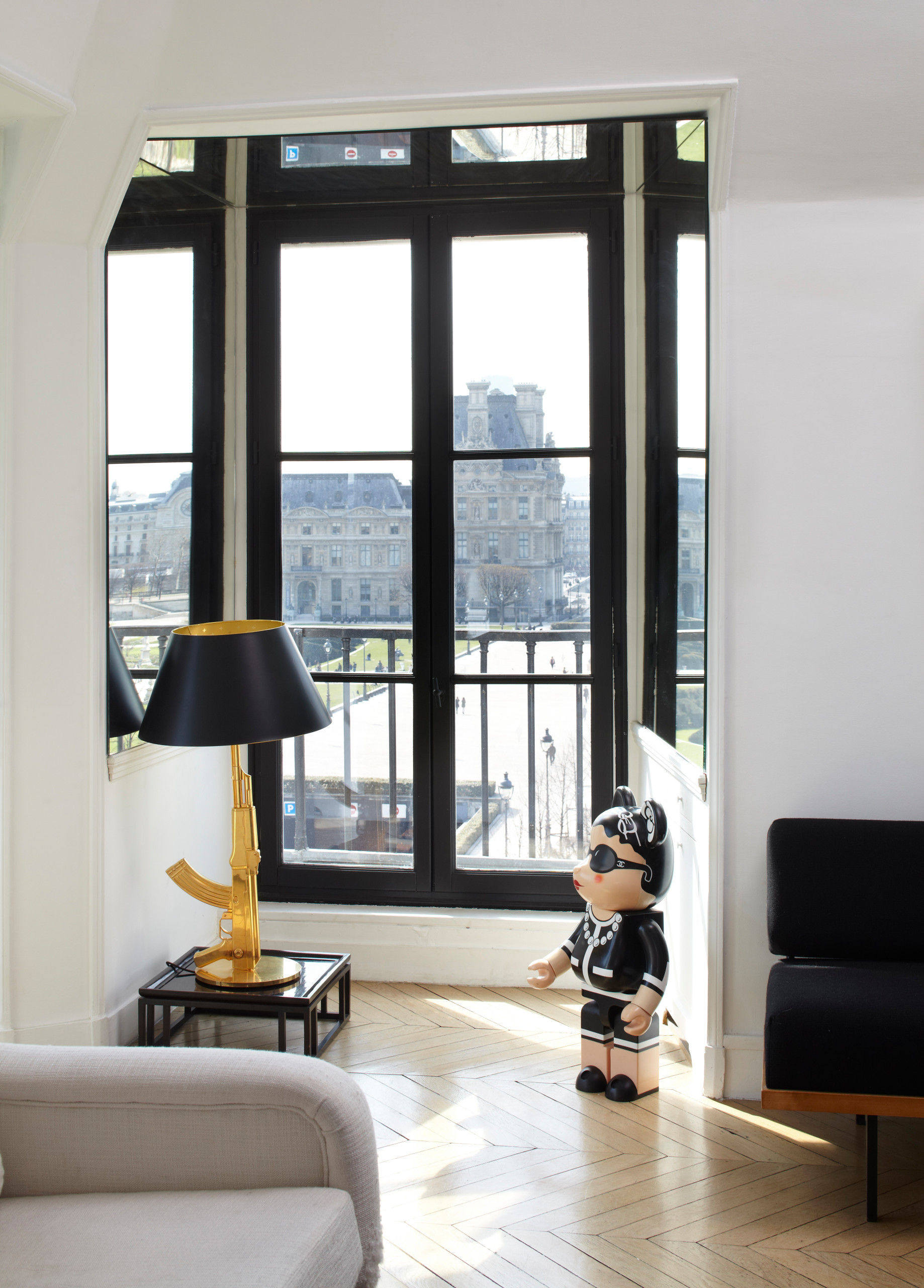 Design engagé, cynique et ô combien subversif pour cette série qui fustige les ventes d’armes orchestrées par les gouvernements occidentaux, la structure dorée venant rappeler le caractère mercantile de ce type de marché occulte. Symboliquement, une partie des gains obtenus par la vente de ces luminaires est reversée par Flos à l’association Frères des Hommes Europe.