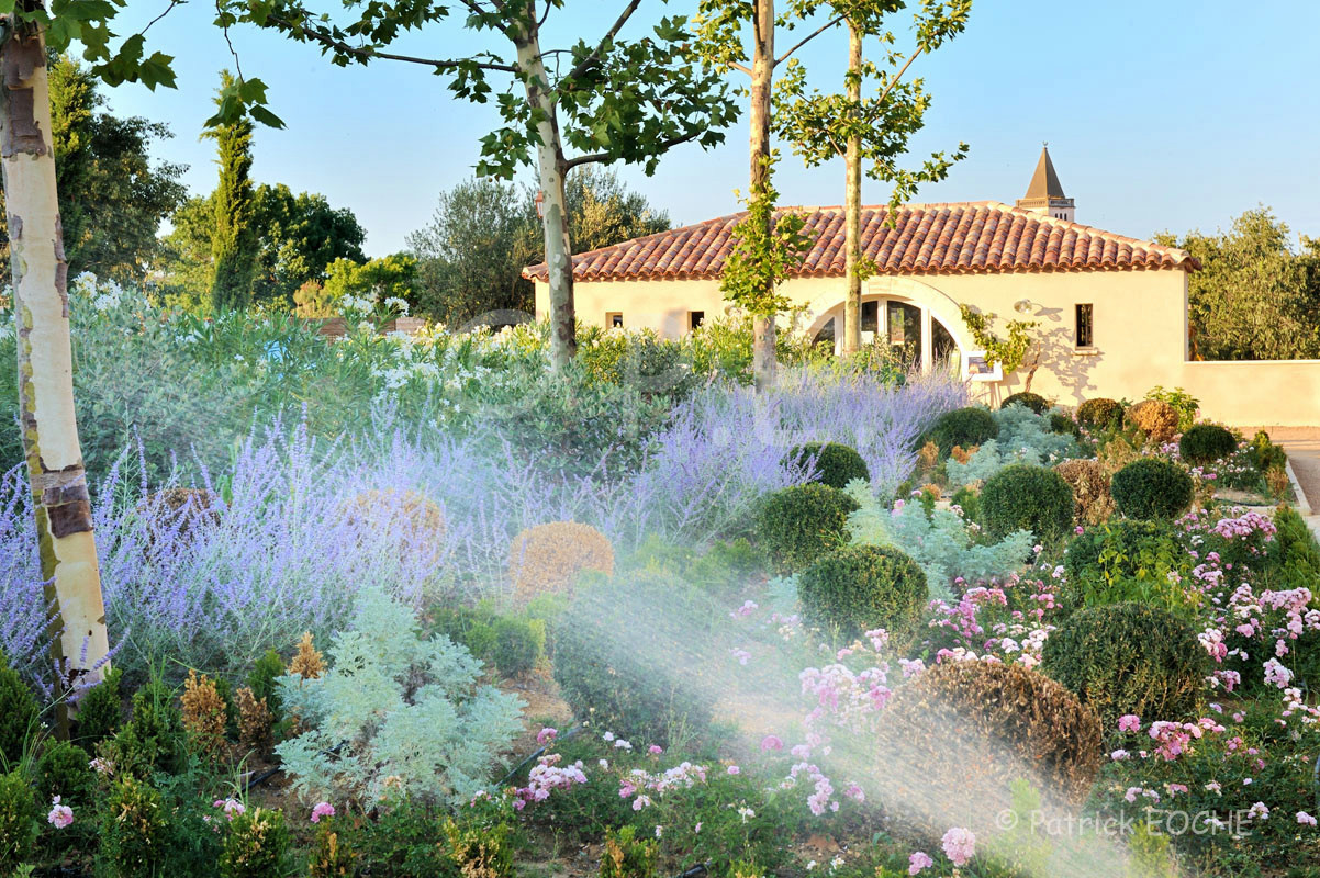 On le sait moins, mais dans le Sud, lorsque l’on plante des végétaux, y compris méditerranéens de type garrigue, l’arrosage est indispensable les premières années en été, le temps que le système racinaire des plantes soit bien développé. Notamment si l’on a planté au printemps… En plantant vers mars-avril, la petite plante connaît une évapotranspiration importante dès l’été et se retrouve vite en stress hydrique. Il faut alors prévoir un arrosage automatique des haies, plates-bandes et autres pendant les premières années : on apporte beaucoup d’eau mais pas souvent, pour que la plante soit obligée de faire de longues racines et qu’elle devienne résistante. Elle pourra alors se débrouiller seule même en cas de forte chaleur et l’arrosage automatique pourra être stoppé.