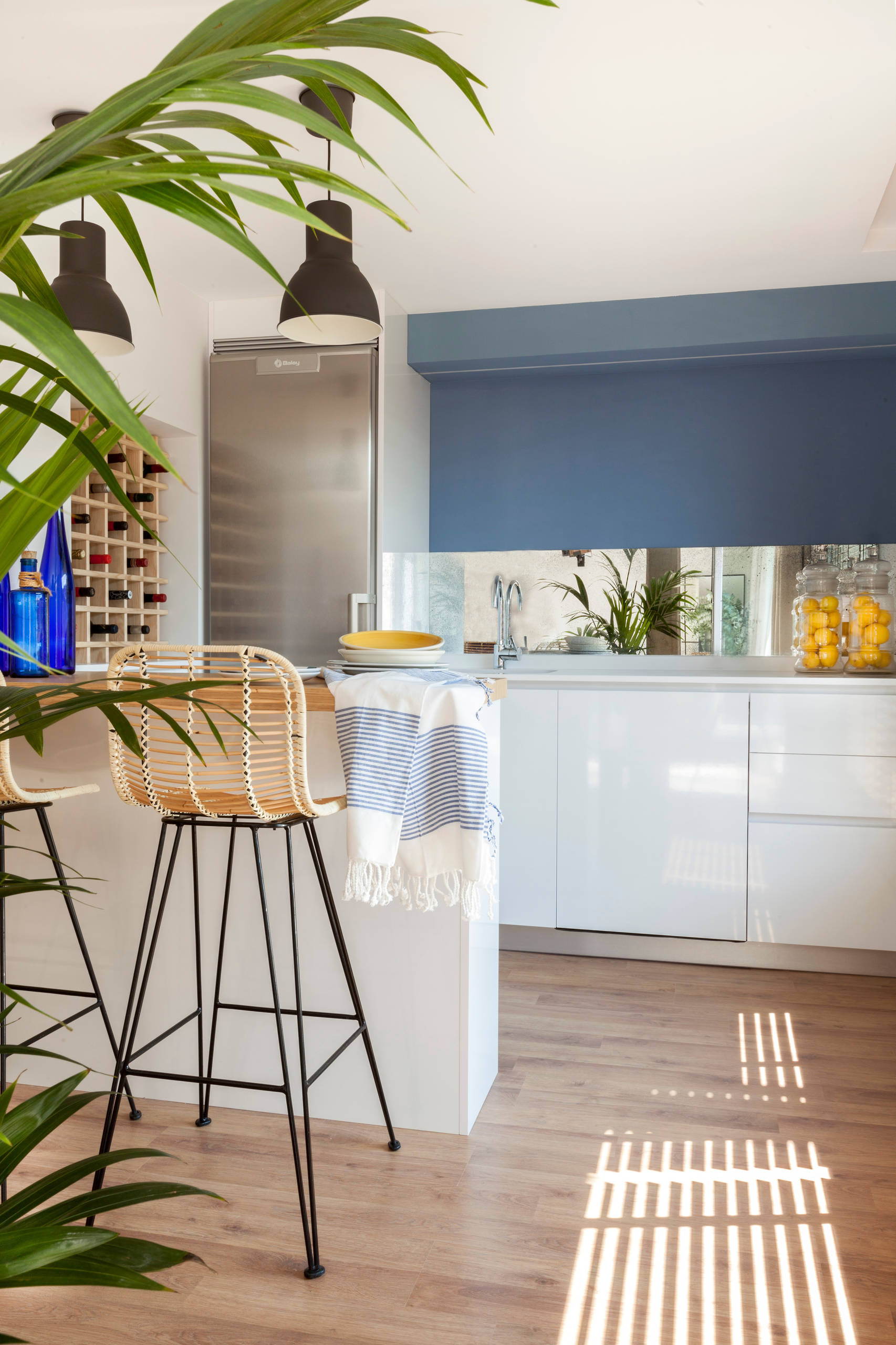 Si dans certaines régions, on imagine le confort qui se dégage d’un espace tourné vers l’intérieur, sous d’autres latitudes plus ensoleillées, on aimerait vivre tourné vers l’extérieur. Dans cette cuisine madrilène, la crédence miroir reflète la nature environnante et oriente directement le regard et l’esprit au dehors.
