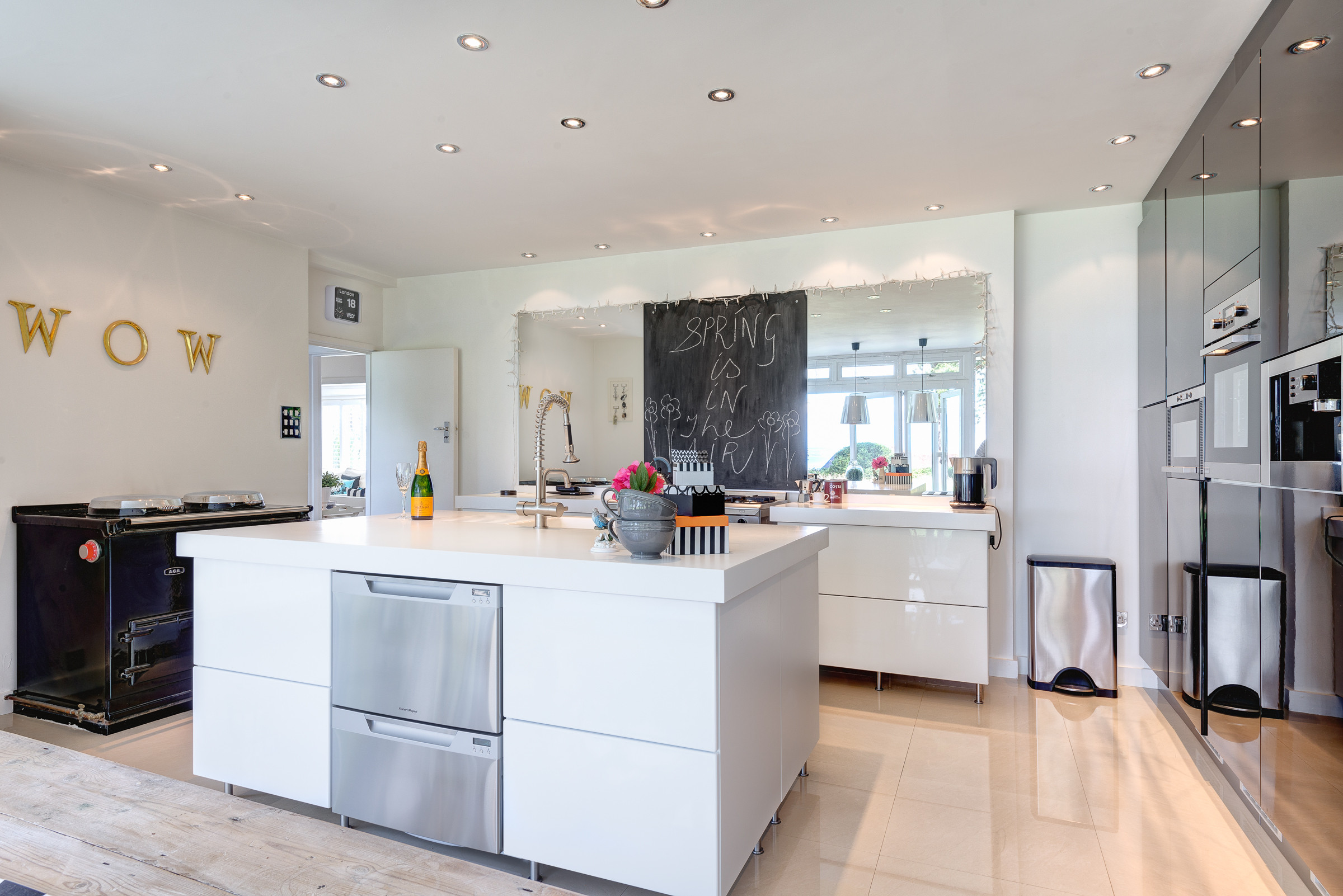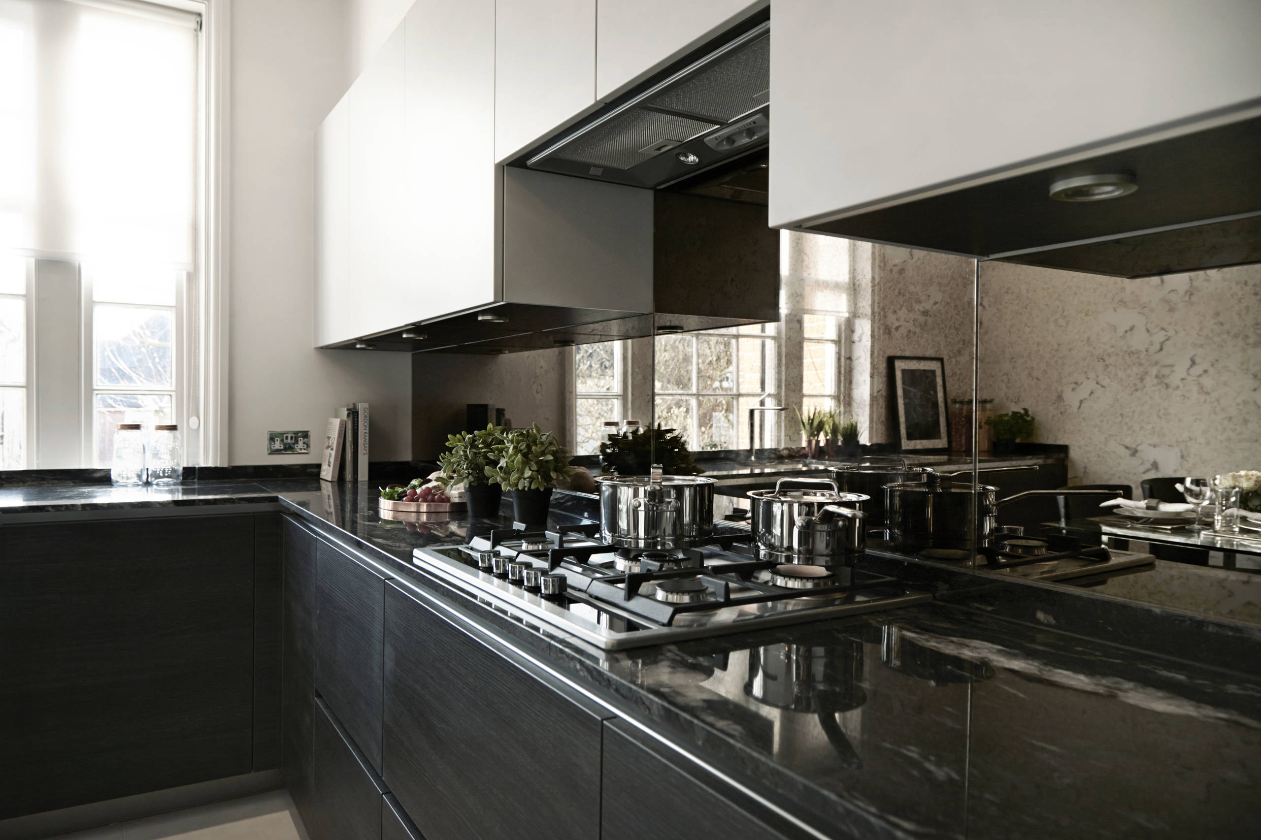Dans cette grande cuisine lumineuse, toute de noir et blanc revêtue, la crédence miroir ne sert ni à agrandir l’espace ni à le rendre plus lumineux, mais aide à articuler les différentes zones entre elles. Si les zones de cuisson, soulignés de noir, font écho au piano Aga, celles de préparation se veulent plus discrètes.