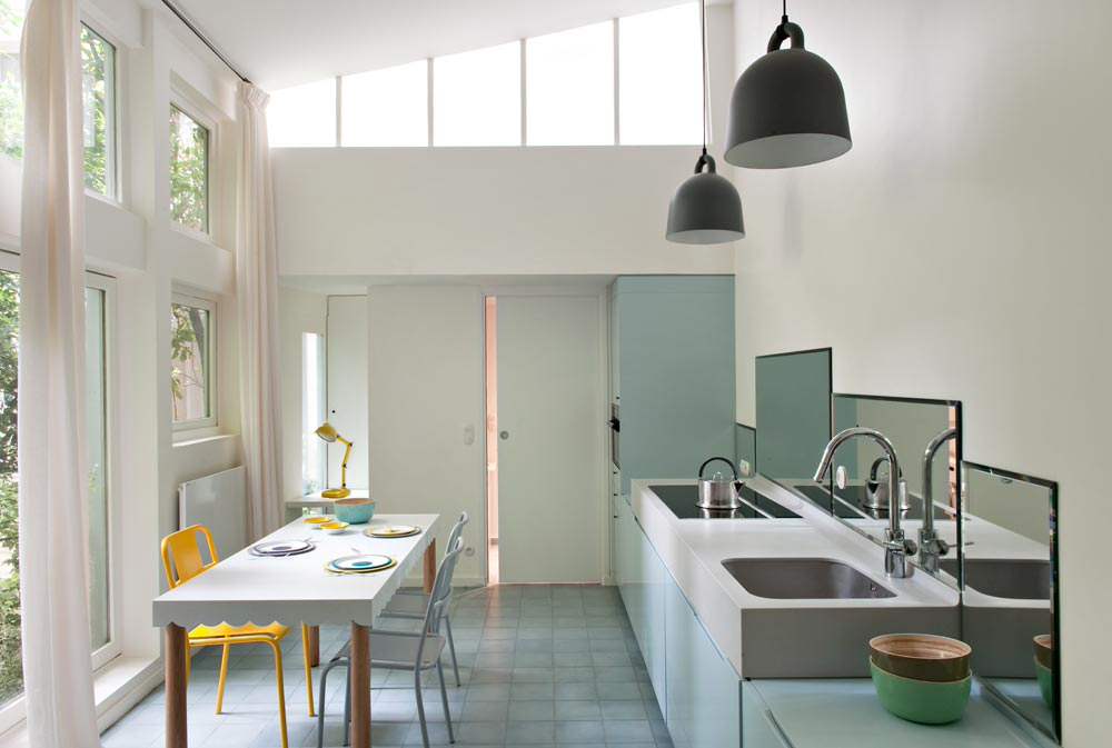 Située sur le mural faisant face à la fenêtre, cette cuisine tout en longueur manquait de profondeur, mais aussi de lumière. Pour éviter de préparer le repas face à un mur borgne et peu avenant, la crédence a été habillée de miroirs, ce qui reflète la lumière et ouvre un regard différent sur le jardin.