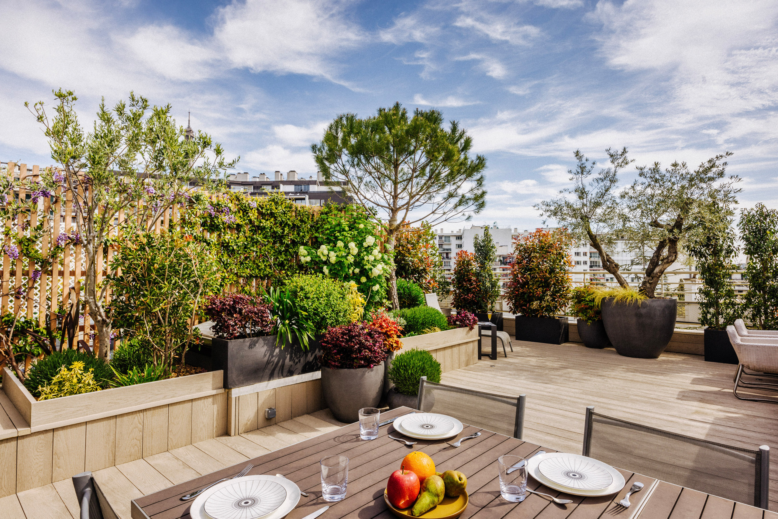 Après. Le sol a donc été repensé avec des lames de bois écologiques et sans entretien, qui se prolongent sur les jardinières. Réalisées sur mesure, celles-ci ont permis de résoudre les problèmes liés à l’étanchéité tout en préservant les racines des plantes et bosquets, judicieusement placés pour cacher les immeubles sans obstruer la vue à 360° sur les environs parisiens. Des claustras complètent cet aménagement ou se lit une harmonie entre le végétal et le design, le tout mettant à l’honneur une nature imposante et luxuriante en milieu urbain.