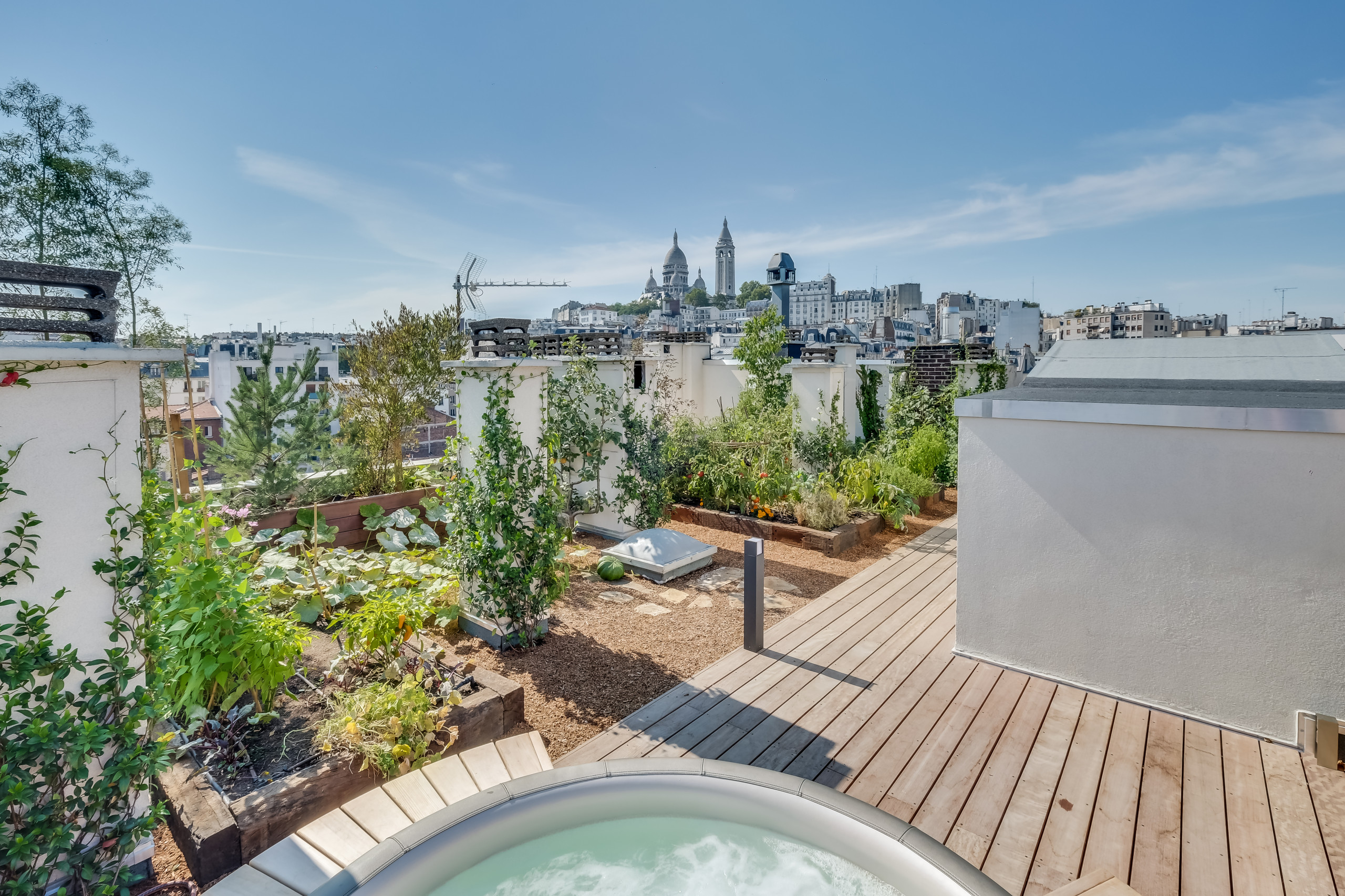 Après. Une terrasse en ipé de 40 m² a été conçue et entoure l’édicule nouvellement créé pour couvrir l’ouverture de trémie qui offre un accès privatif au toit depuis l’appartement. Elle accueille l’espace de vie et le jacuzzi, délimités par des enclaves plantées qui habillent les bords du plancher. Mais le point fort de ce projet, ce sont certainement les potagers en pleine terre construits avec des traverses de chemin de fer. Plusieurs bacs en bois sur mesure, dans lesquels ont été plantés différents arbres, sont également présents pour traiter les vis-à-vis, alors que des plantes grimpantes et des fruitiers évoluent sur les nombreuses cheminées.