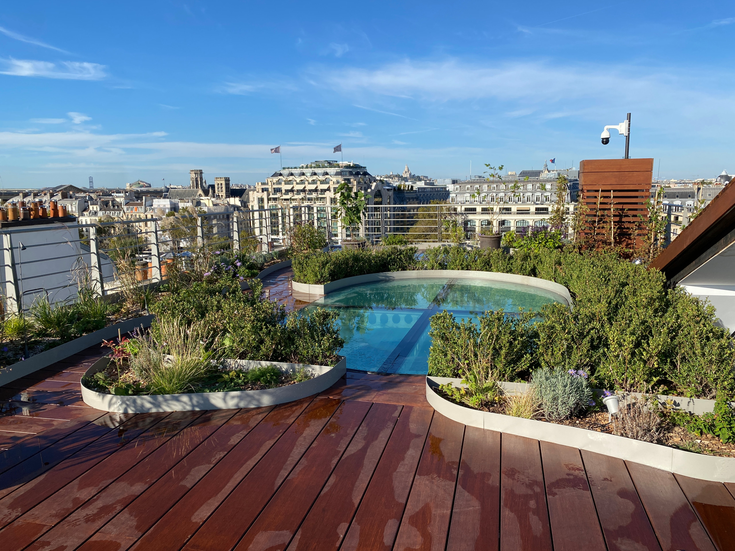 Après. La nouvelle verrière trône au milieu du nouvel ensemble tel un bassin dans un jardin. En tout, trois espaces dédiés à la relaxation et à la contemplation de la vue sur Paris ont été créés et reliés entre eux par des cheminements qui évoluent dans des touffes d’arbustes et des masses herbacées, au caractère champêtre. De grandes jardinières sur mesure en métal, assorties aux toits en zinc de la capitale, accueillent ces plantations. L’accès à ces bulles végétales se fait désormais par une trappe recouverte de bois que l’on aperçoit sur la droite de la photo. Fermée, elle disparait complètement.