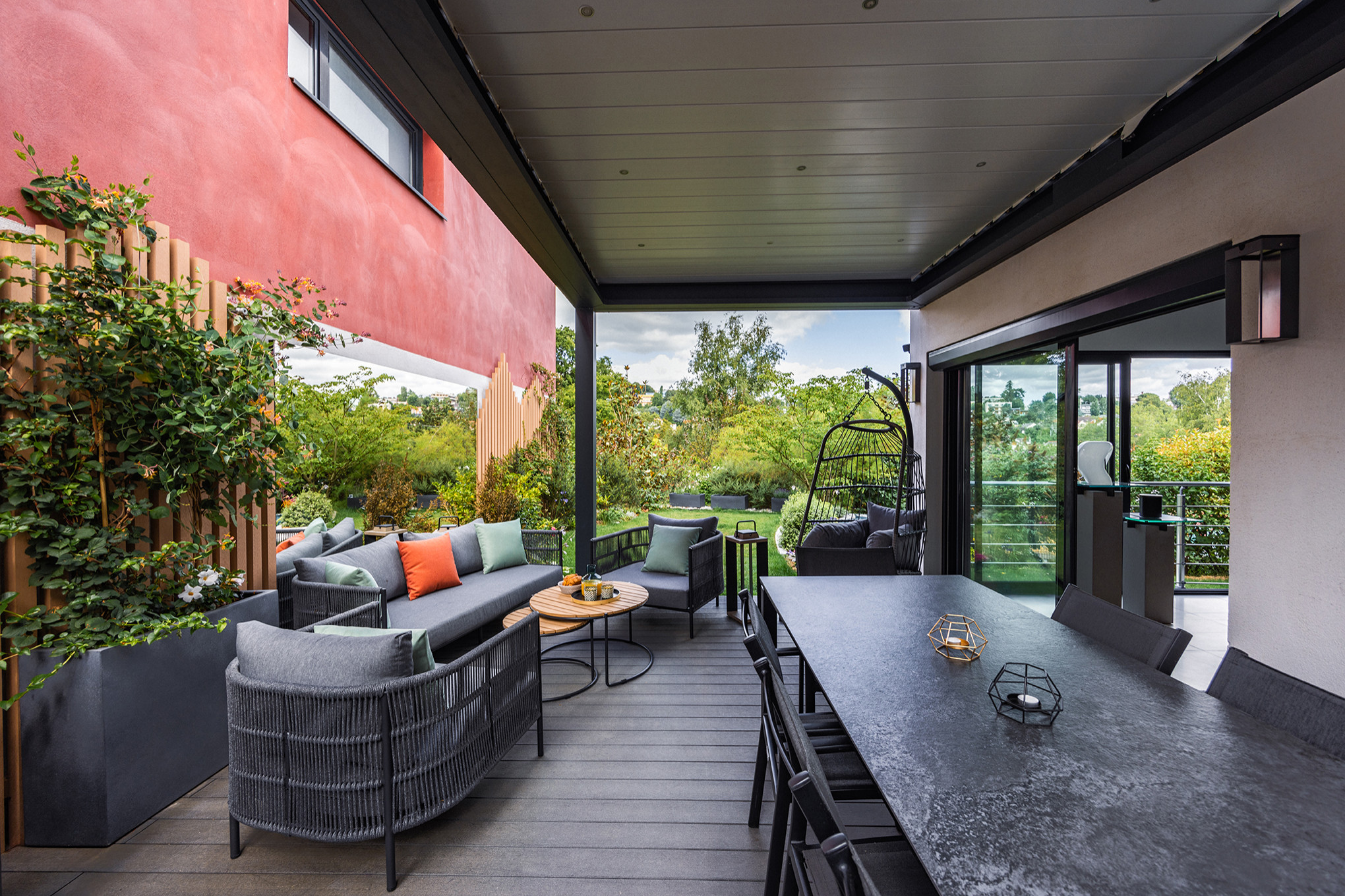 Après. Grâce a un aménagement pensé sur mesure pour les lieux, la terrasse est devenue une vraie pièce en plus pour la maison. Un travail important a été consacré à la réalisation d’un coin salle à manger ombragé par une pergola, dotée de détecteurs pour s’incliner en fonction de l’ensoleillement. La sensation d’étroitesse a été atténuée par la mise en place d’un miroir sur le mur, qui crée un effet de profondeur. Le tout est sublimé par un mobilier outdoor judicieusement choisi pour l’espace.