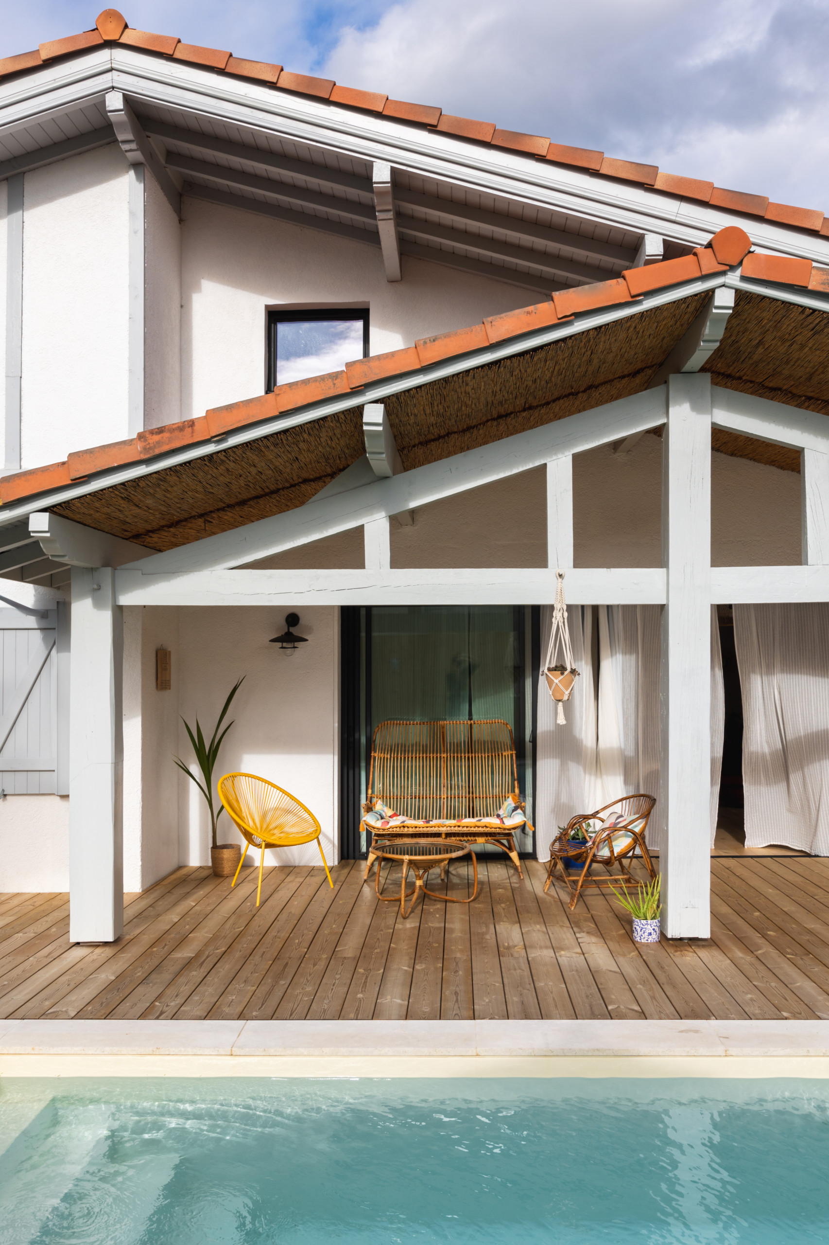 Après. Celle-ci a donc été réduite en profondeur et transformée en loggia, sous laquelle une terrasse en pin des Landes a été posée. En plus de d’apporter une ambiance plus contemporaine à la bâtisse, ces deux choix ont redonné du charme à la façade arrière de la maison, l’avancée couverte étant un élément classique de l’architecture des ostaus landais. Aussi, la terrasse en béton a laissé place à une agréable piscine, dont le bassin s’étend sur 7 × 4 mètres.