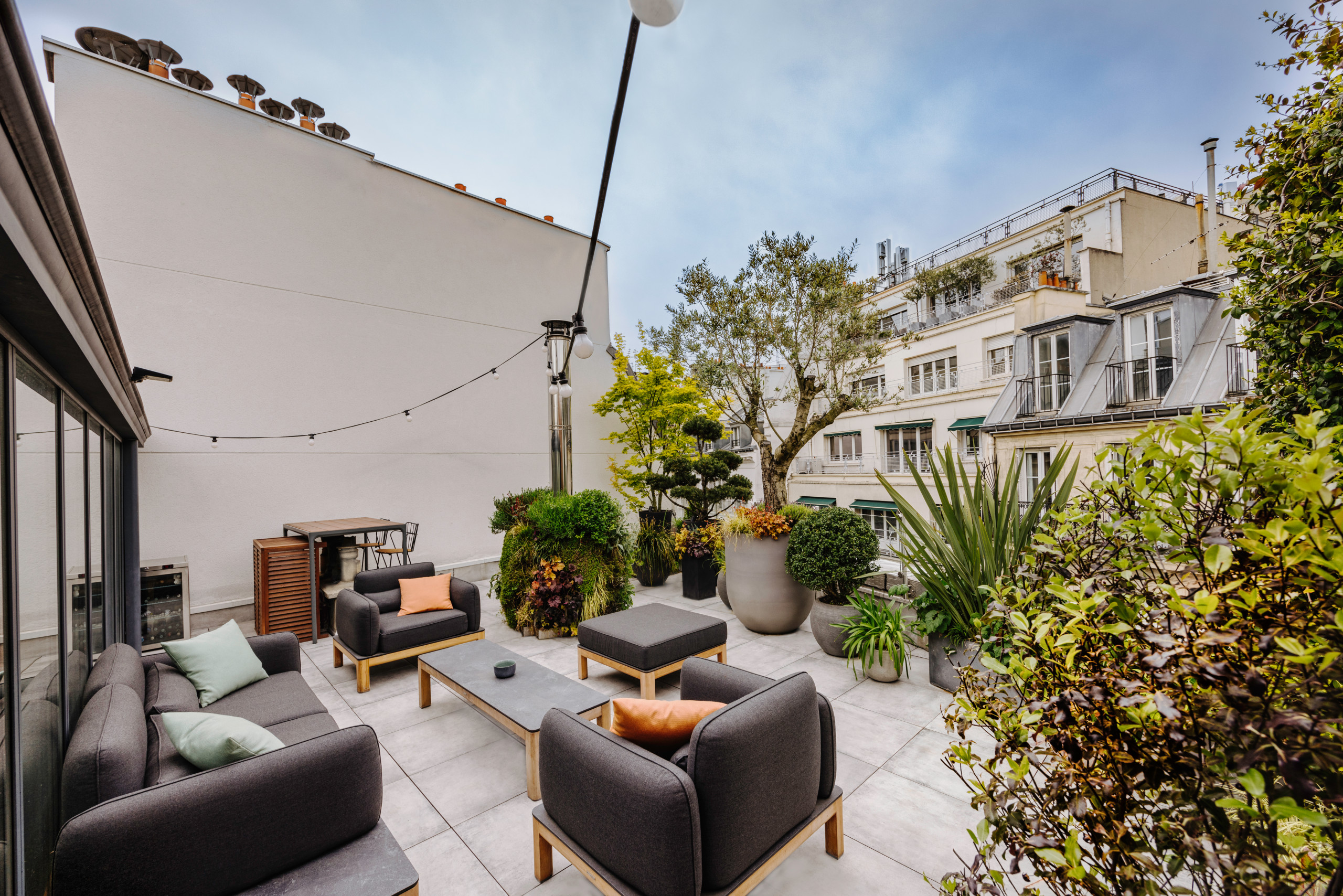 Avant. Avant l’intervention des paysagistes de la société Terrasse et Jardin de Paris, ce toit-terrasse situé dans le quartier du Marais n’avait rien d’attrayant à l’exception de sa vue sur les hauteurs du 3ᵉ arrondissement de la capitale. Tout était à imaginer pour métamorphoser les lieux en espace cosy et faire oublier l’environnement urbain qui les entoure.