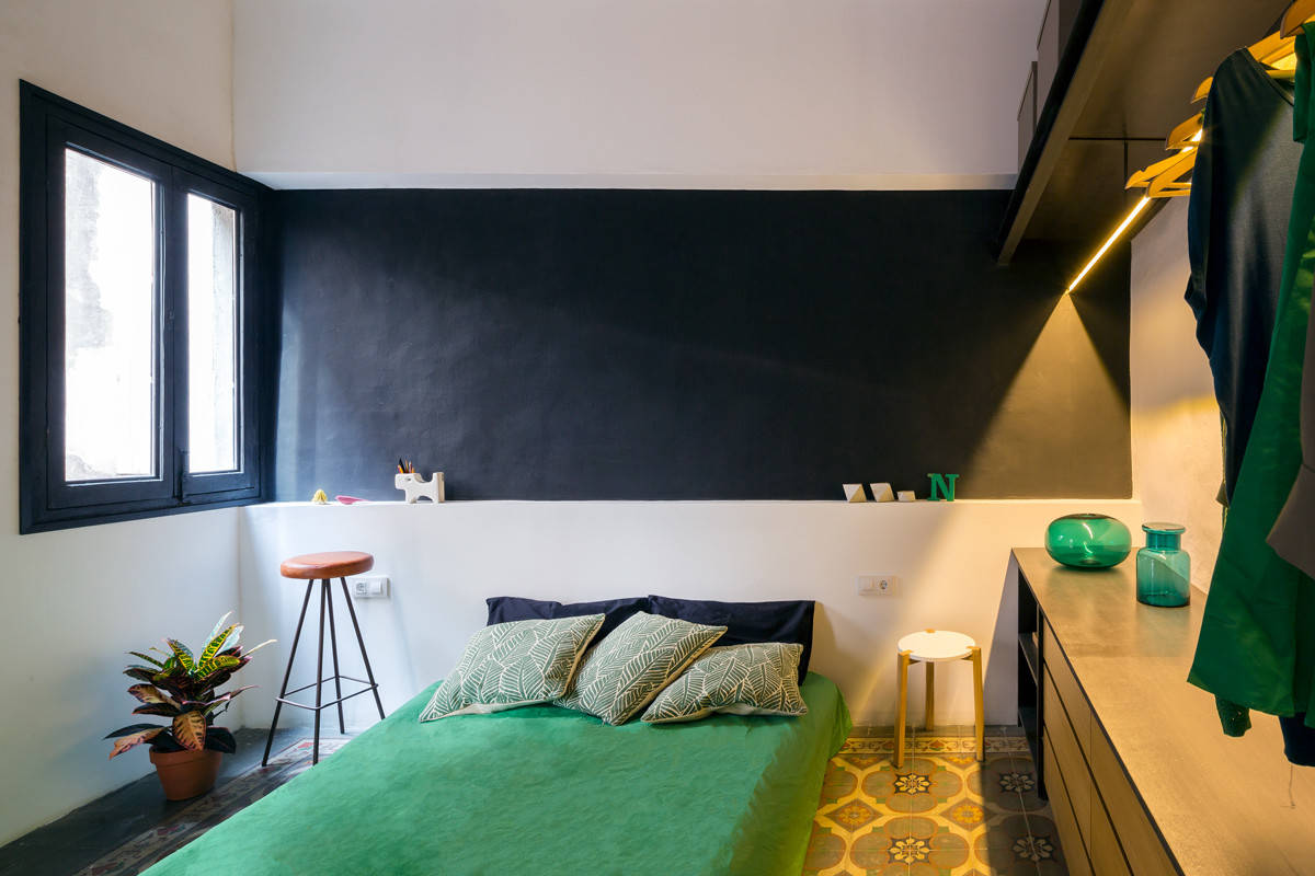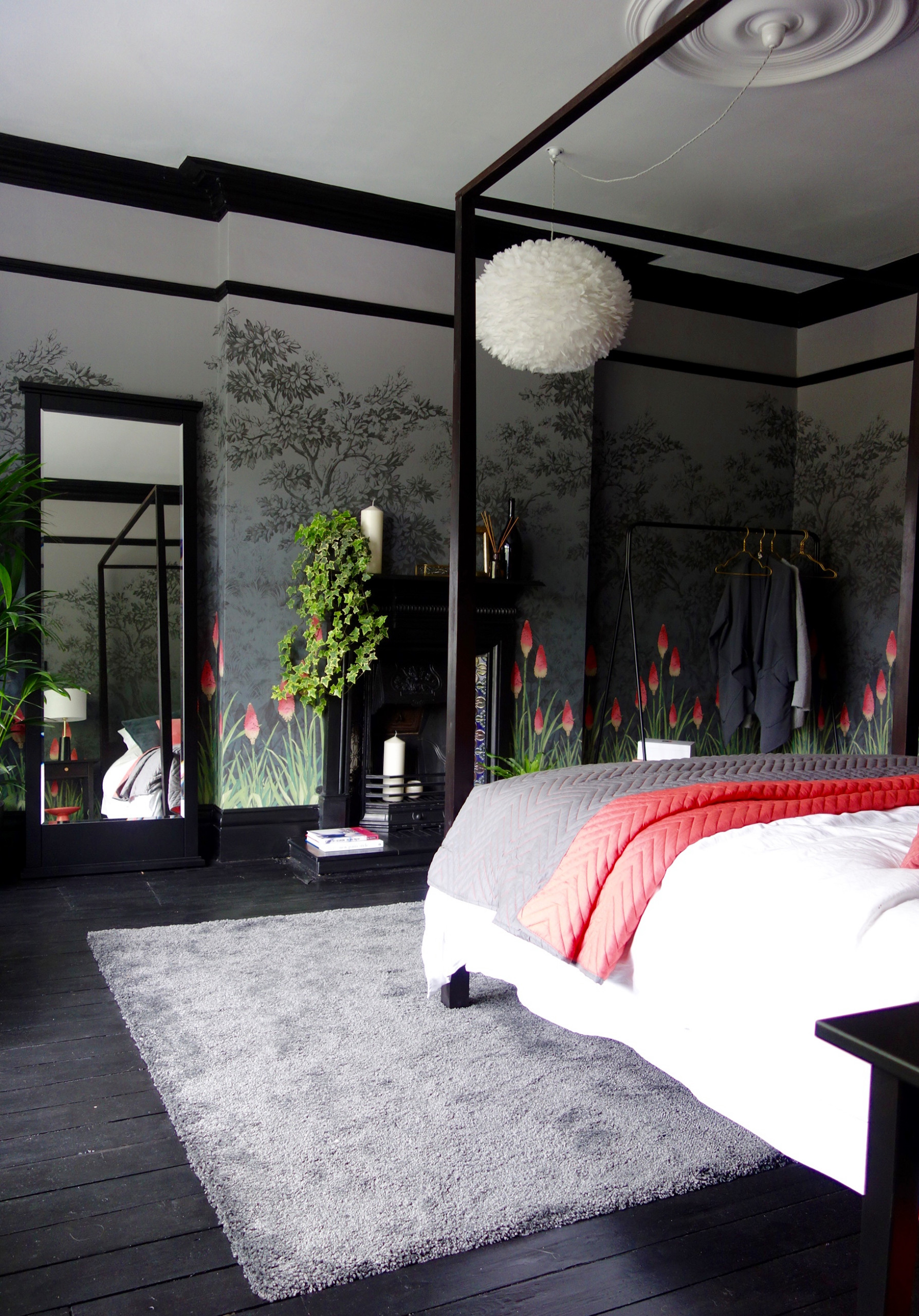 On aime : Le parquet peint en noir dans la chambre à coucher. Il crée un cocon enveloppant qui accentue l’effet intime et privé du lieu.