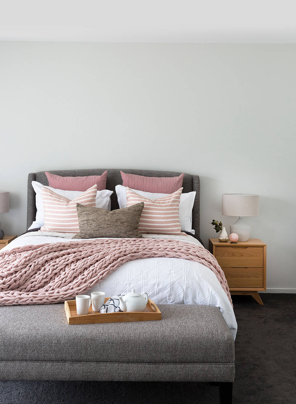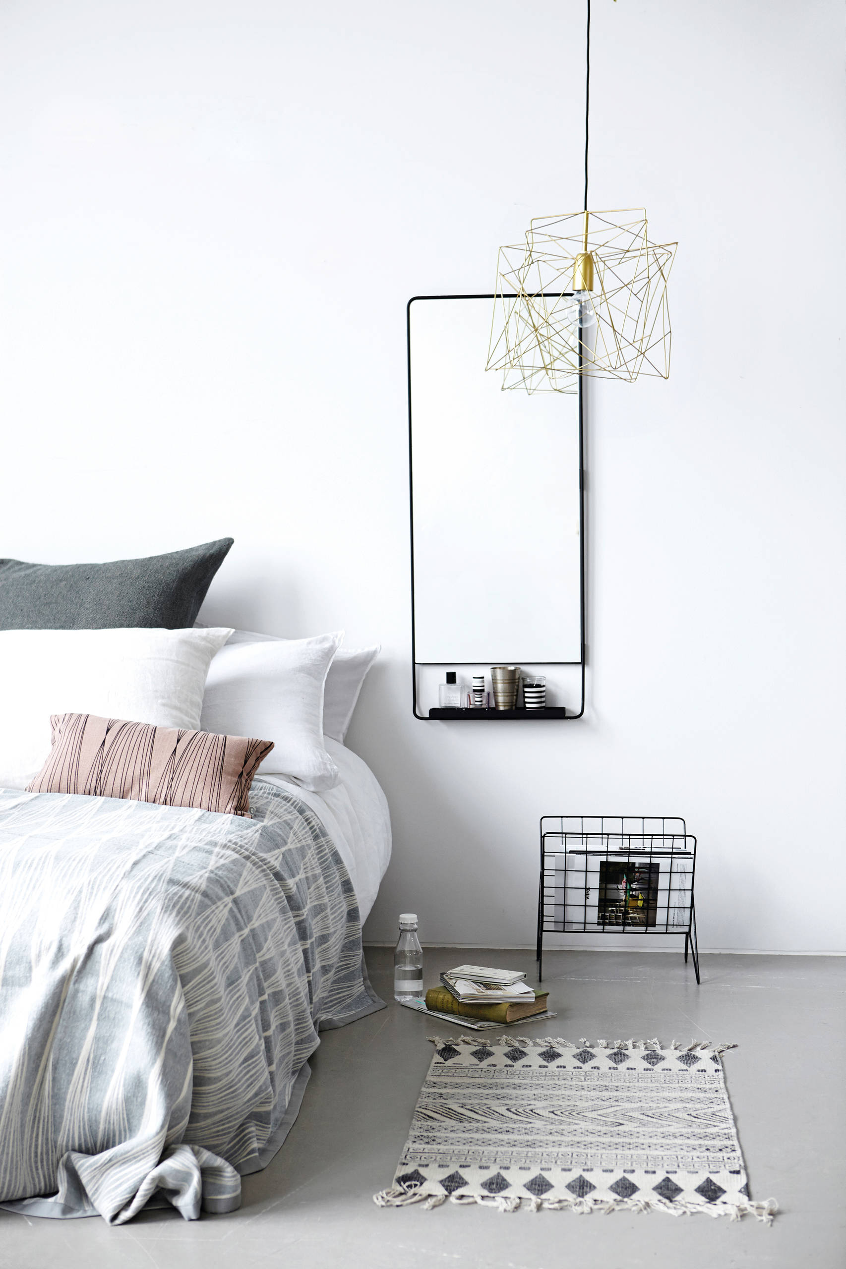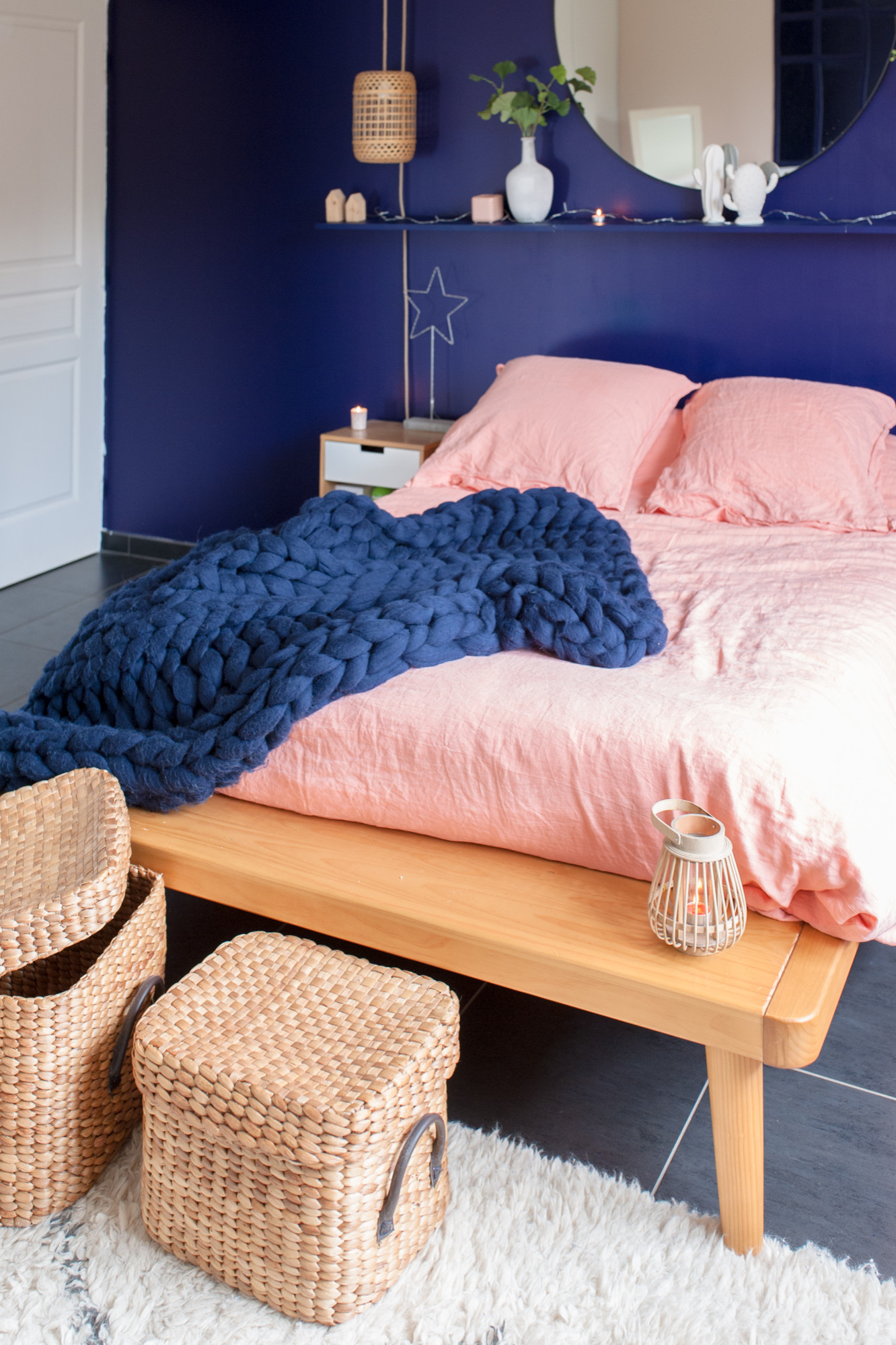 On aime : Les accessoires décoratifs tel que tapis et plaid, qui contrebalancent la sensation de froid du carrelage dans la chambre.