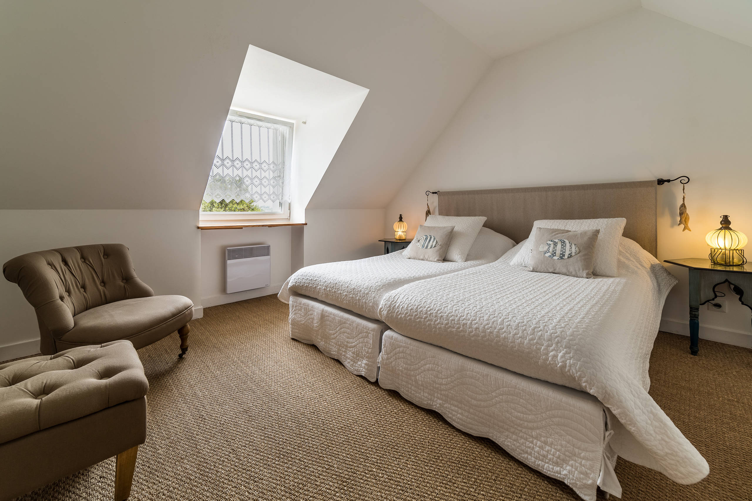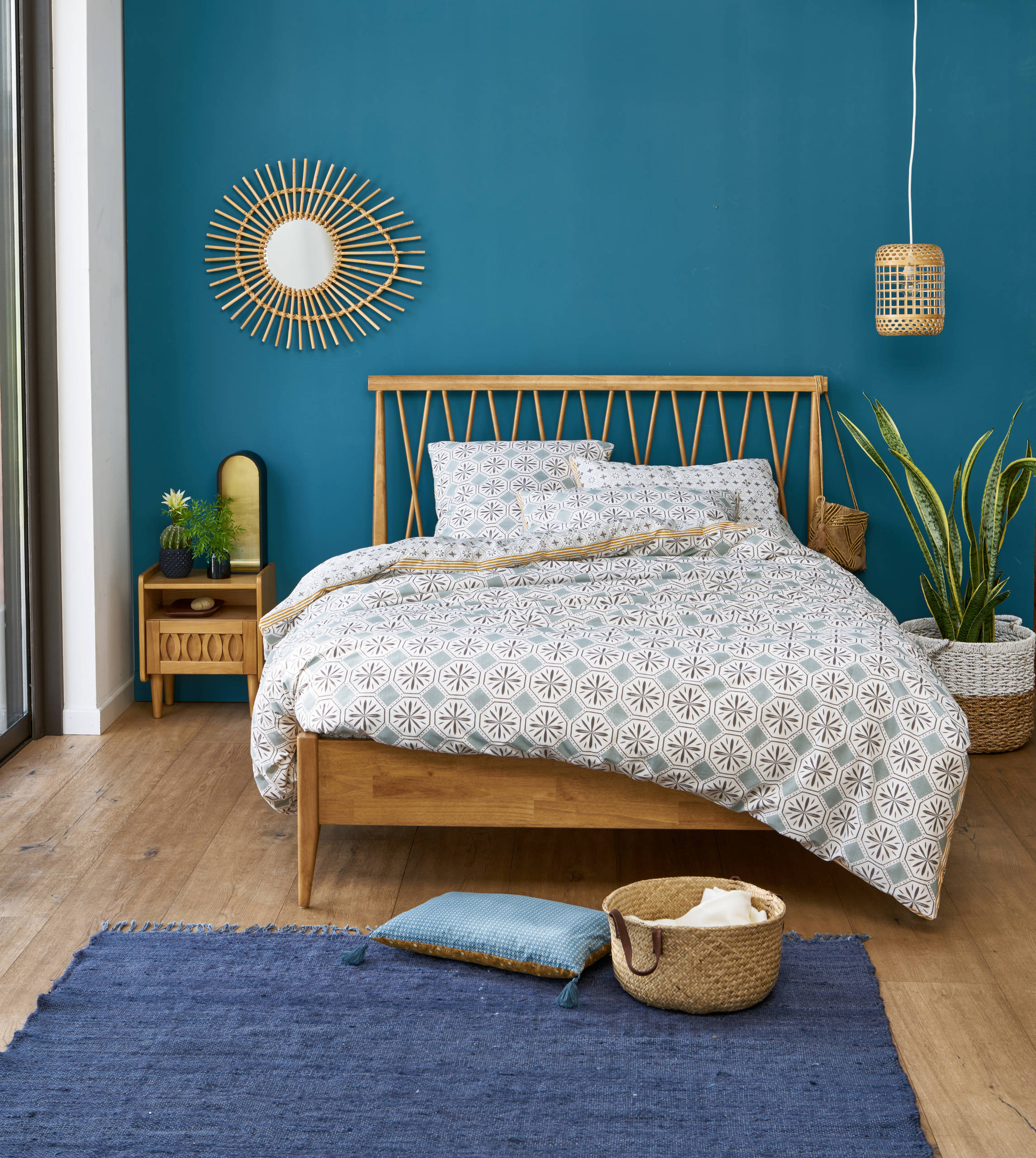 On aime : Le vent d’exotisme qui souffle dans la chambre à coucher avec le sisal, que l’on accentuera avec des accessoires marins ou artisanaux selon les envies.