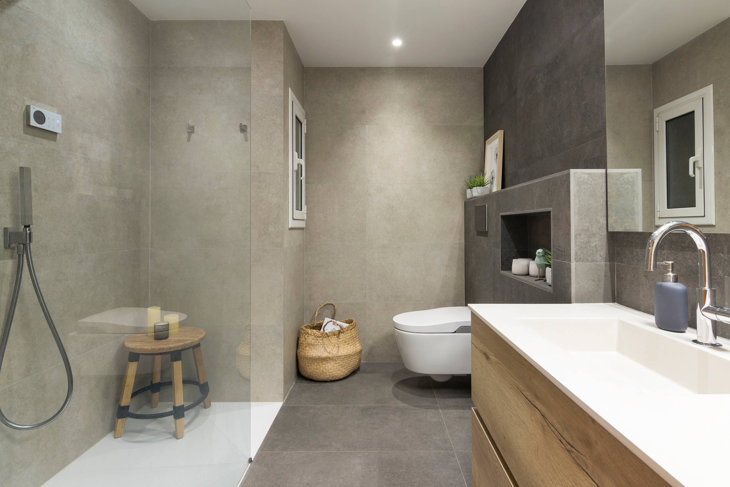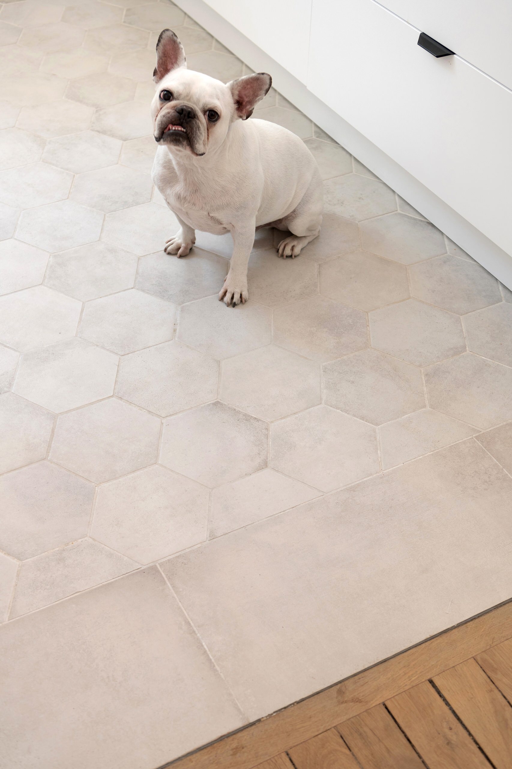 Les tonalités de gris et les tons pierre des carreaux imitation béton ou ciment sont parfaites pour dissimuler les traces, grâce à leur texture et leur teinte.