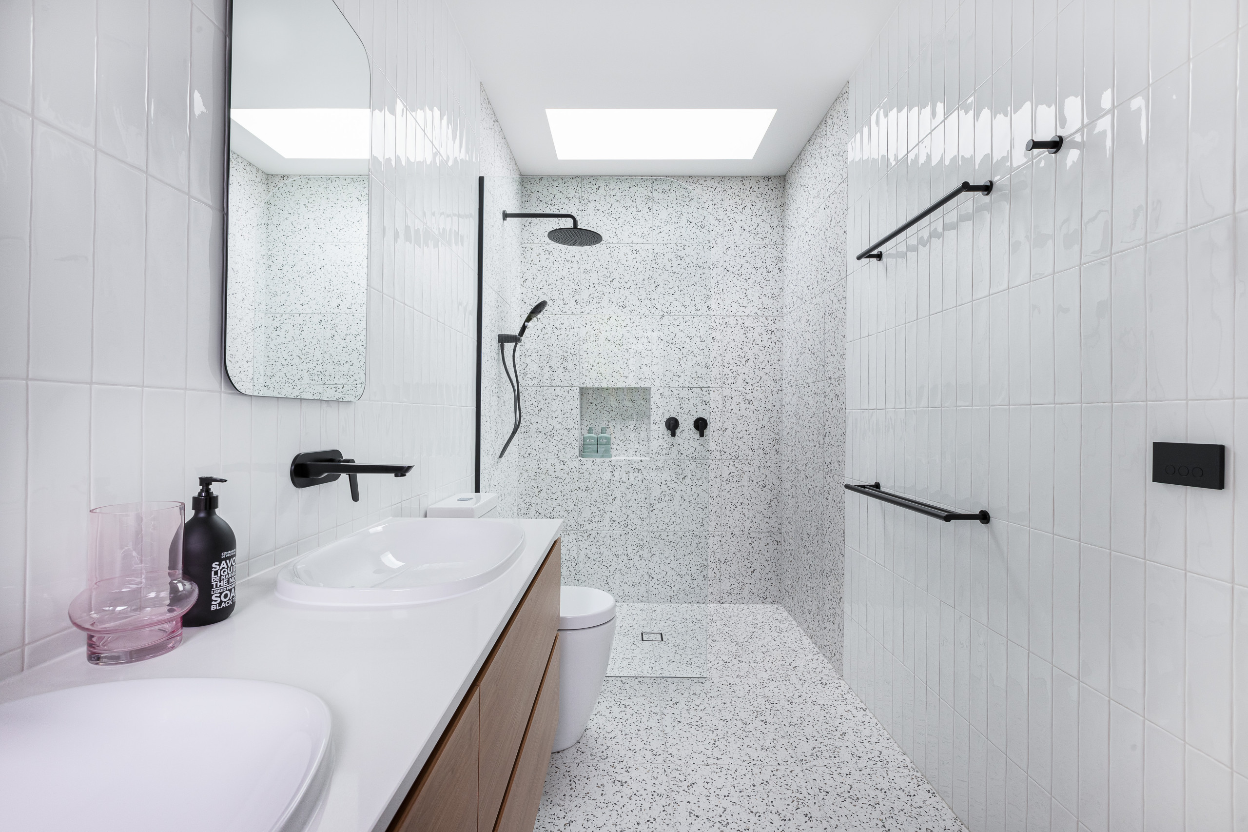 Dans le même esprit, les sols mouchetés sont parfaits pour cacher les petites projections du quotidien. Dans une salle de bains au sol ou en total look murs compris, le carrelage moucheté et son aspect très contemporain offre un décor original et un confort d’entretien au quotidien.