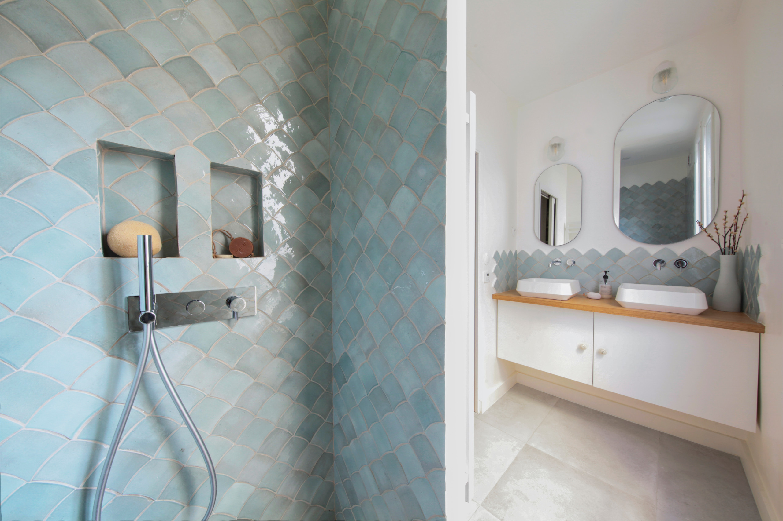 Les zelliges, ces carreaux marocains artisanaux, très en vogue actuellement, sont parfaits pour masquer d’éventuelles traces de calcaire ou de savon dans une douche. En effet, leur particularité et leur charme réside dans le fait que leur aspect ne soit pas uniforme, puisqu’ils sont façonnés à la main. Ainsi, dans une même gamme de couleurs, on pourra trouver des variations de teinte assez sensibles qui attirent l’œil et masquent le reste.