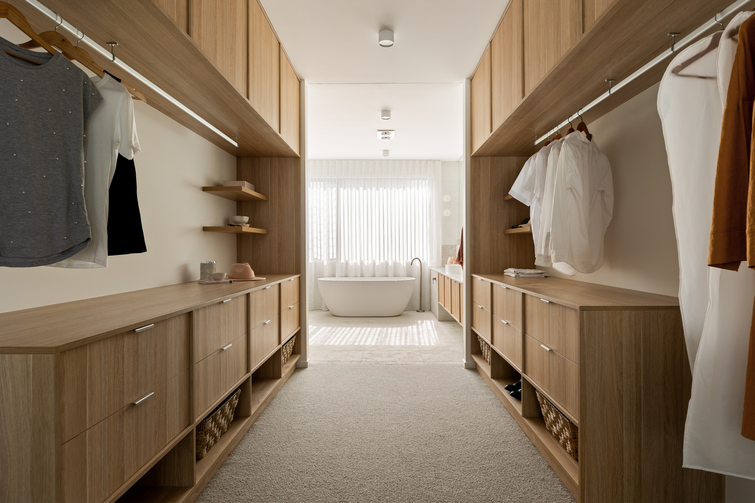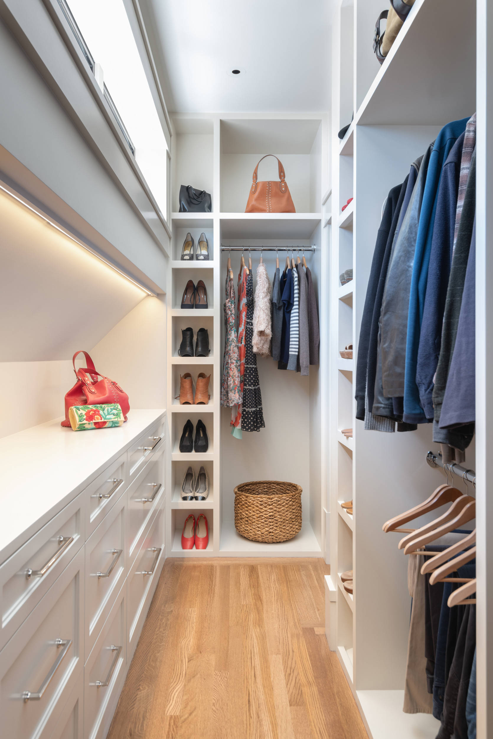 N’oubliez pas des espaces disponibles pour ranger les valises ou autres volumineux comme des couettes. L’idéal est de les mettre en hauteur pour conserver un accès aisé au vêtements du quotidien. Si nécessaire, prévoyez un petit tabouret que vous laisserez à demeure dans votre dressing pour accéder à tous les rangements hauts.