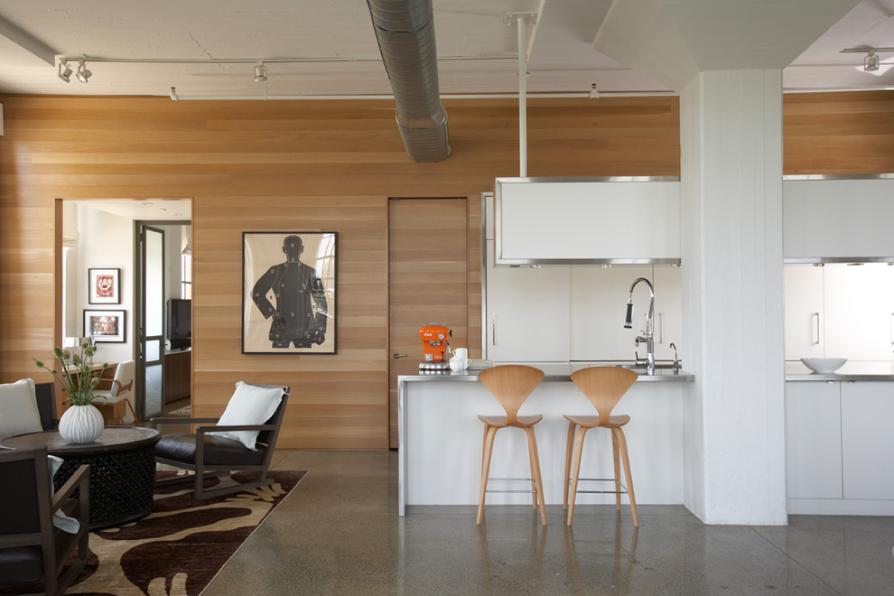 Un circuit d’eau qui court au plafond et une colonne qui descend en prime ? Pourquoi ne pas utiliser l’astuce ci-dessus, à savoir réaliser un coffrage qui encadre la cuisine. Celle-ci est soulignée par ce stratagème et les espaces délicatement marqués à l’heure où l’on a du mal à donner une identité à des espaces trop ouverts.