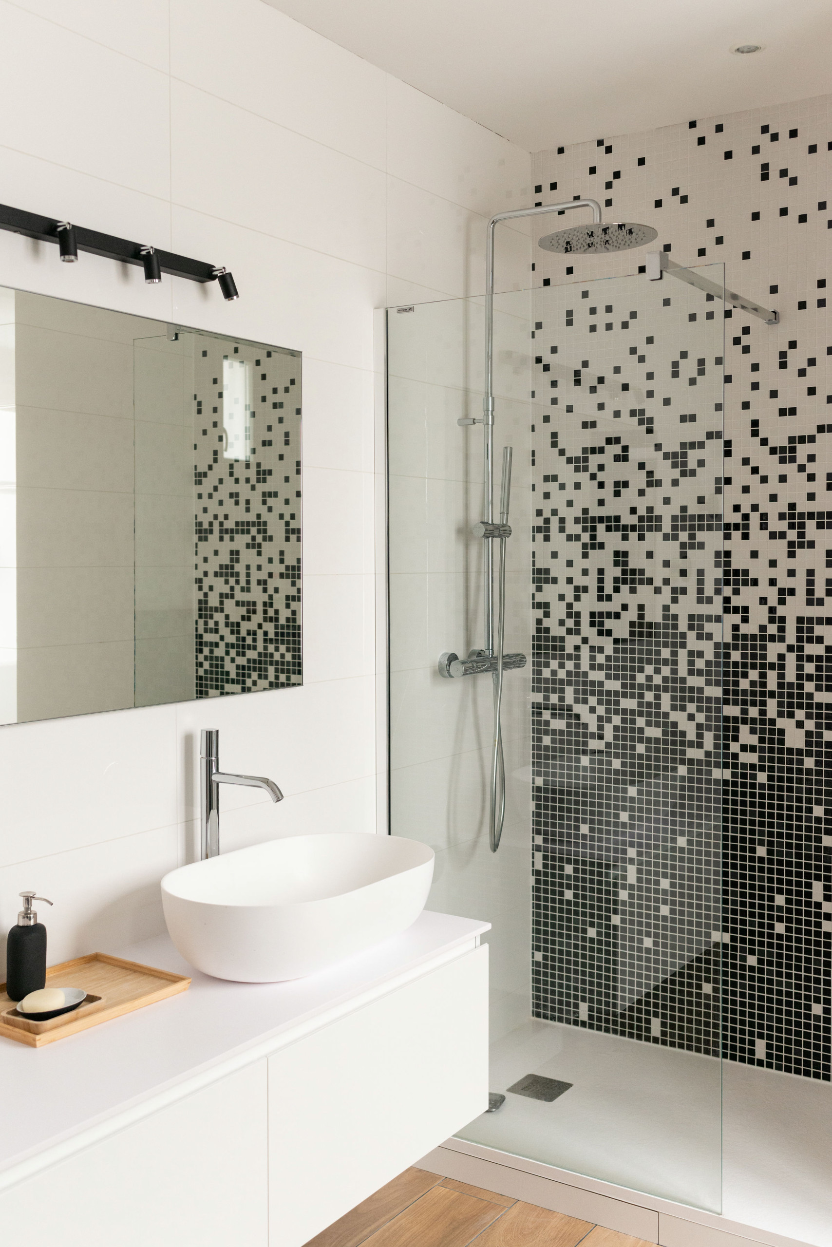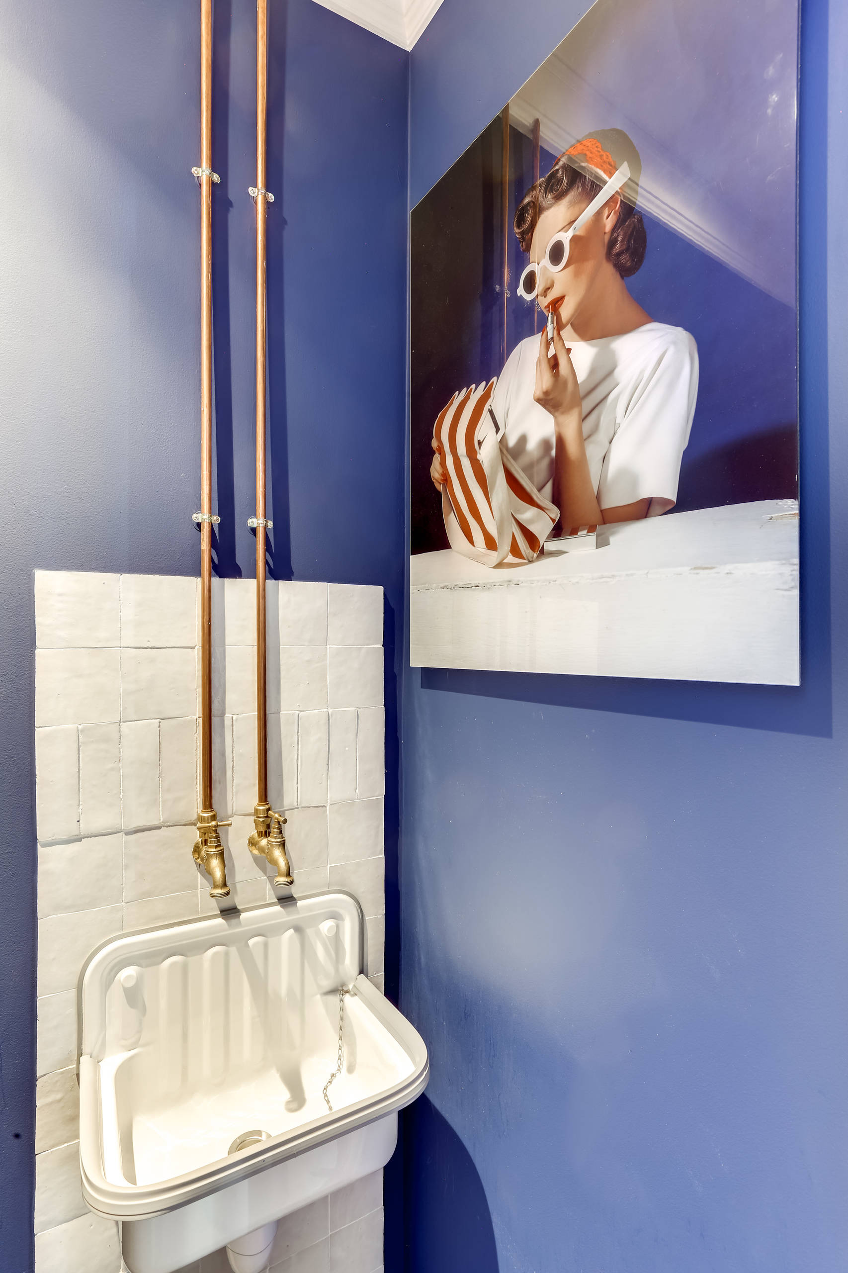Dans cette autre salle de bains, les arrivées d’eau ont été coffrées de sorte à créer une étagère sur toute la longueur de la pièce. C’est une idée maligne qui offre des rangements supplémentaires tout en cachant les tuyaux disgracieux.