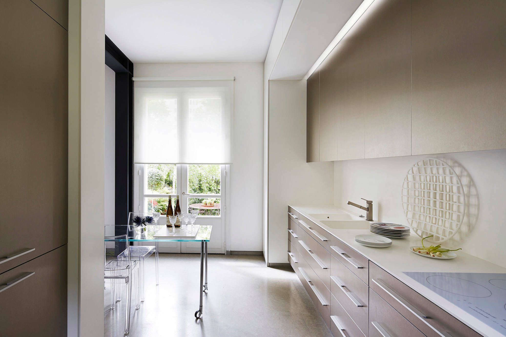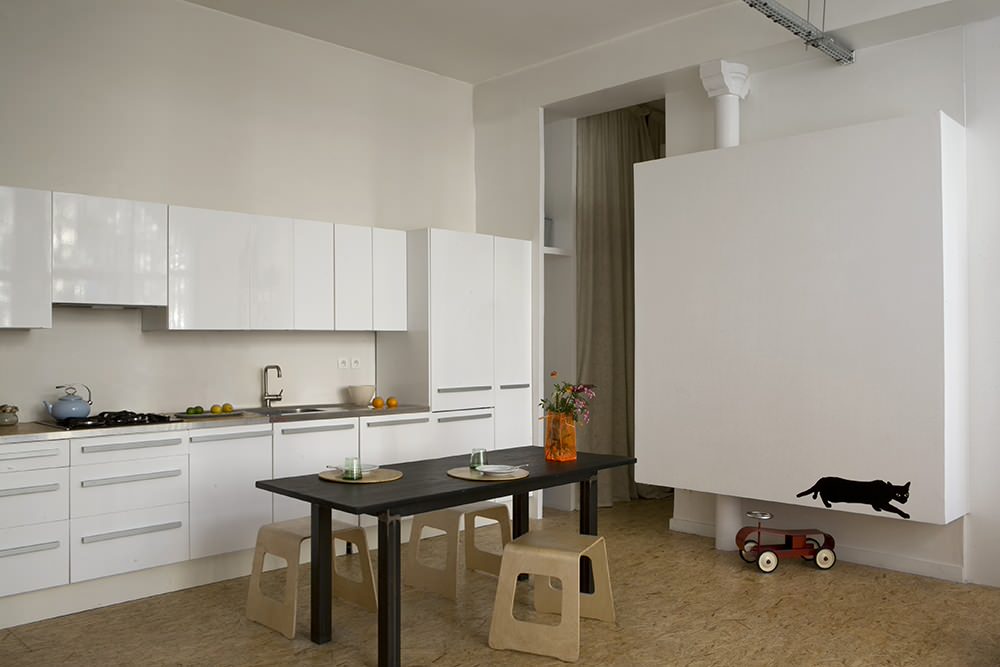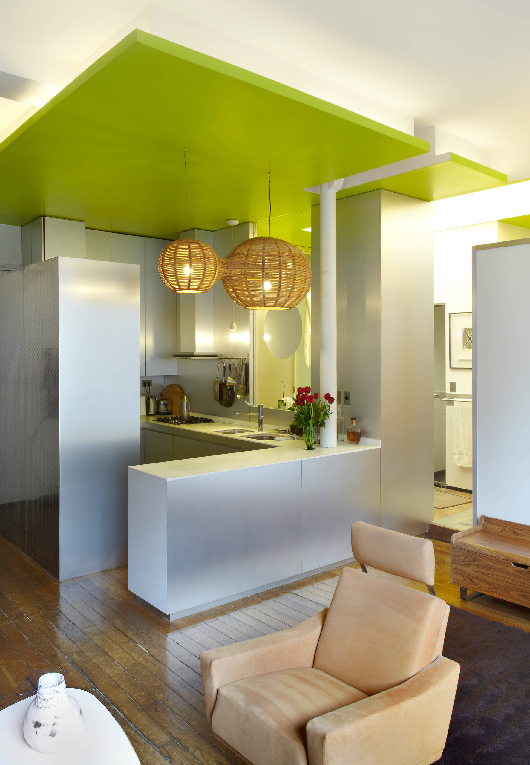 Les professionnels dignes de ce nom n’ont pas peur des contraintes techniques qui nous font nous arracher les cheveux. Ici, l’architecte Éric Gizard s’est servi de la colonne d’évacuation qui traverse son appartement comme d’un support en trompe-l’œil pour son faux plafond vert. Juste au coin de la cuisine, c’est le détail qui fait twister le reste.
