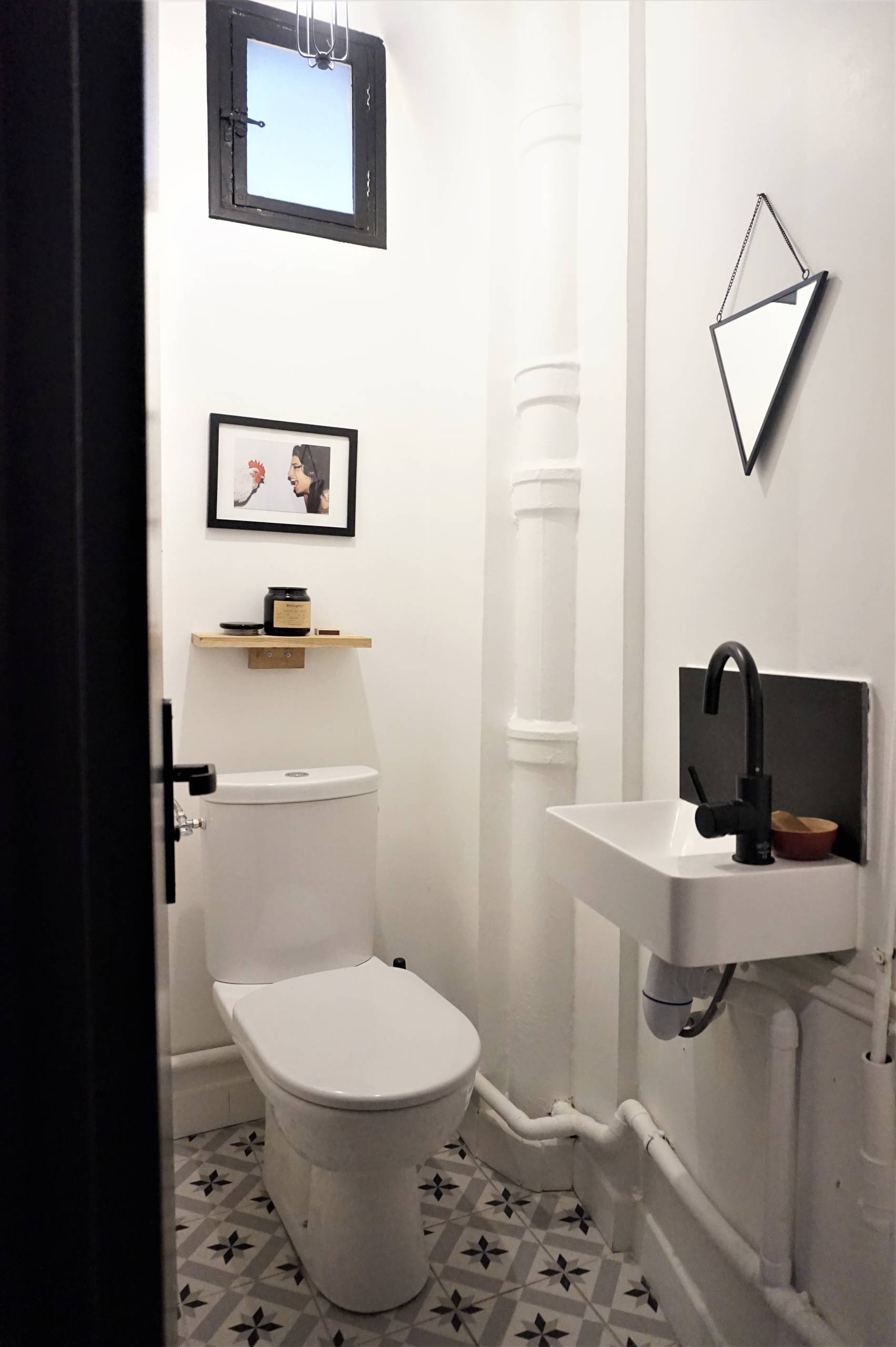 C’est également la solution bien connue de l’étagère à mi-hauteur qui a été retenue pour l’installation de ces toilettes. Cette étagère correspond tout simplement au « bâti-support » nécessaire à la fixation de la cuvette suspendue. La plupart du temps, on coffre le mur jusqu’en haut, mais la petite étagère est une solution qui permet de poser quelques objets du quotidien.
