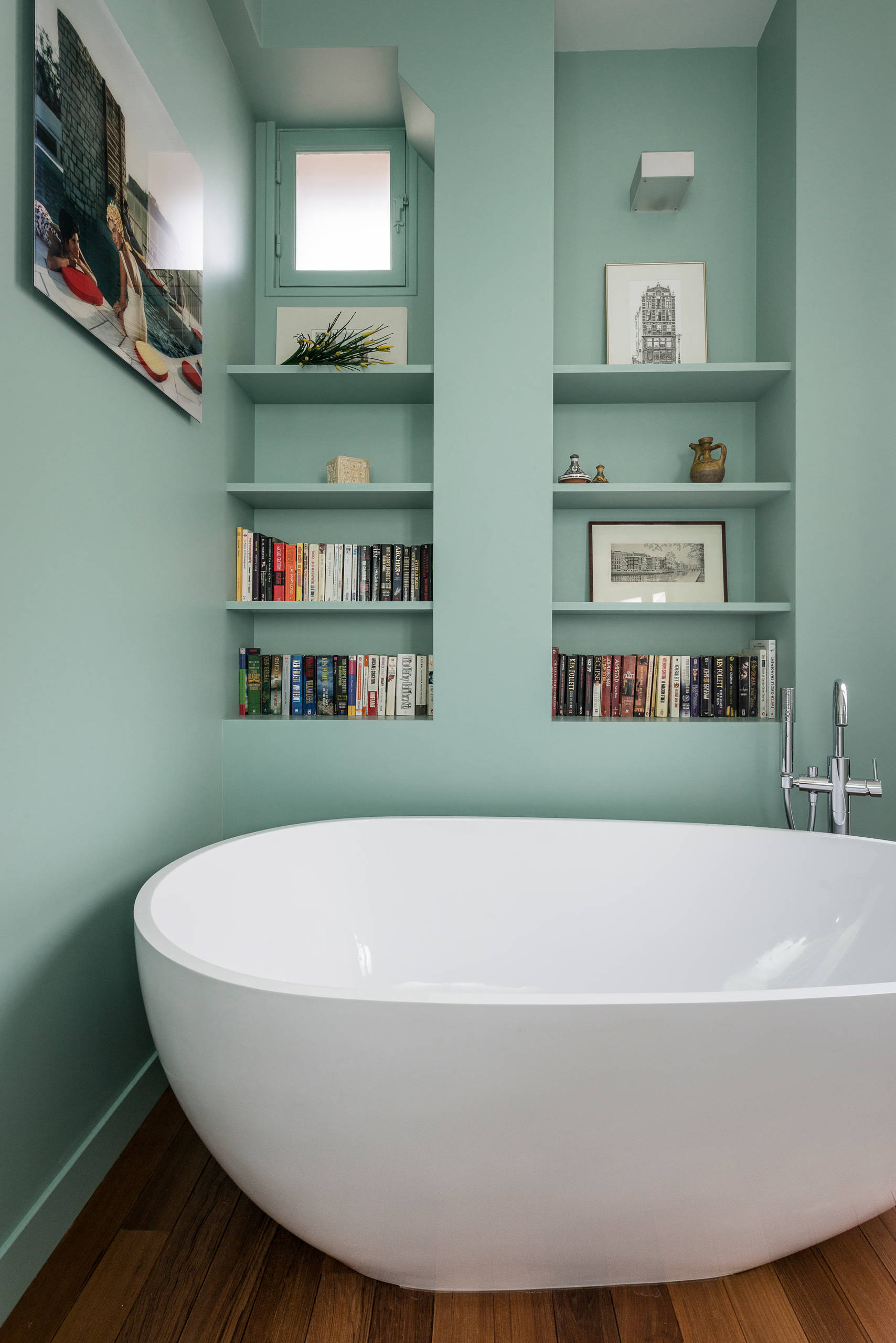 Quand il faut gérer la présence d’une colonne descendante et la création d’une arrivée d’eau pour la baignoire, la solution du coffrage d’un mur derrière lequel on cache toute la « technique » et qui se transforme en bibliothèque a fait ses preuves.