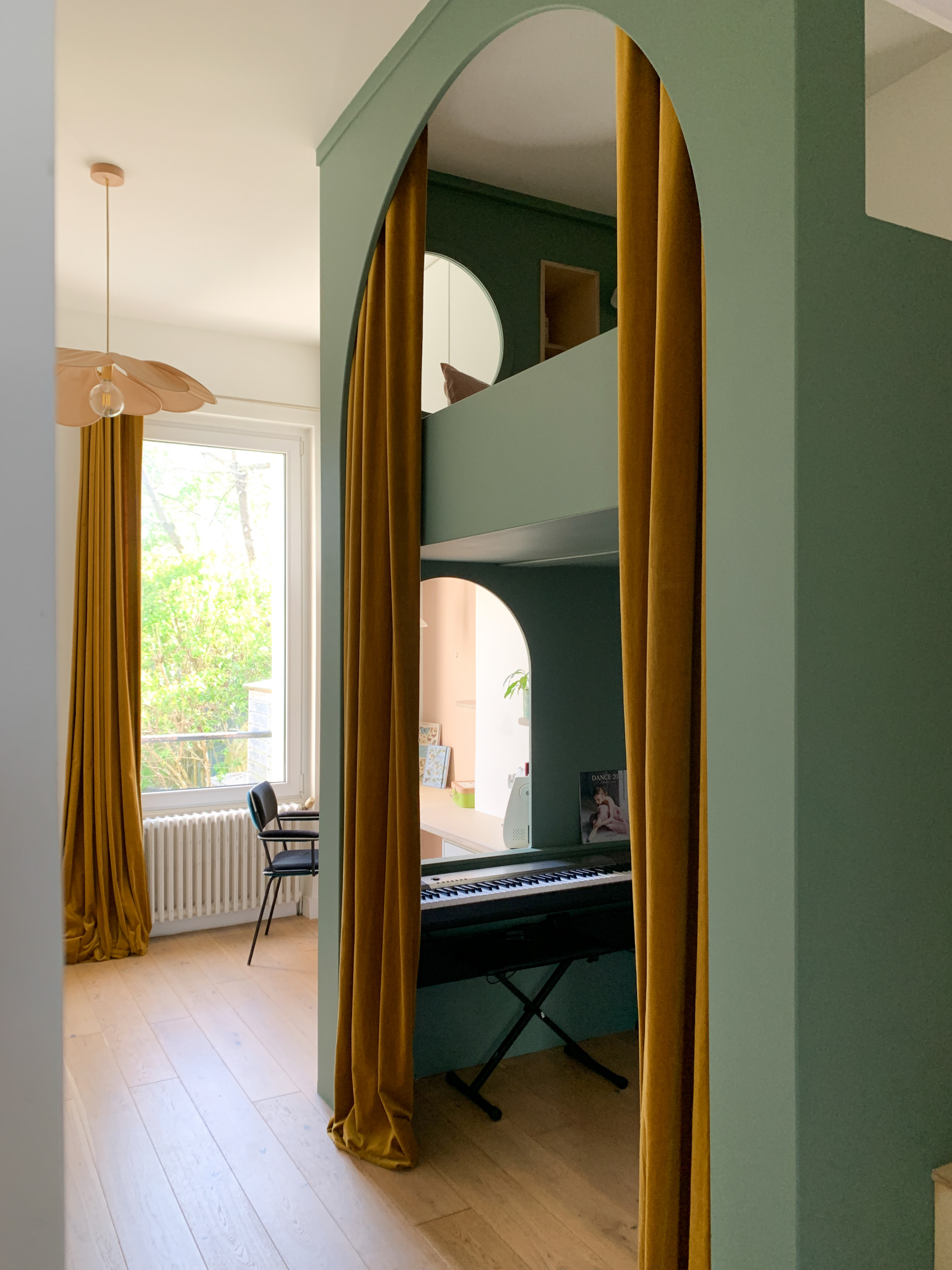 Après. L’ancienne armoire inadaptée a été remplacée par un bureau en contreplaqué de bouleau bénéficiant de rangements en partie haute. Celui-ci se prolonge jusqu’à la structure cabane parée d’un vert tendre, accueillant l’espace nuit, un dressing et un emplacement pour loger un piano.