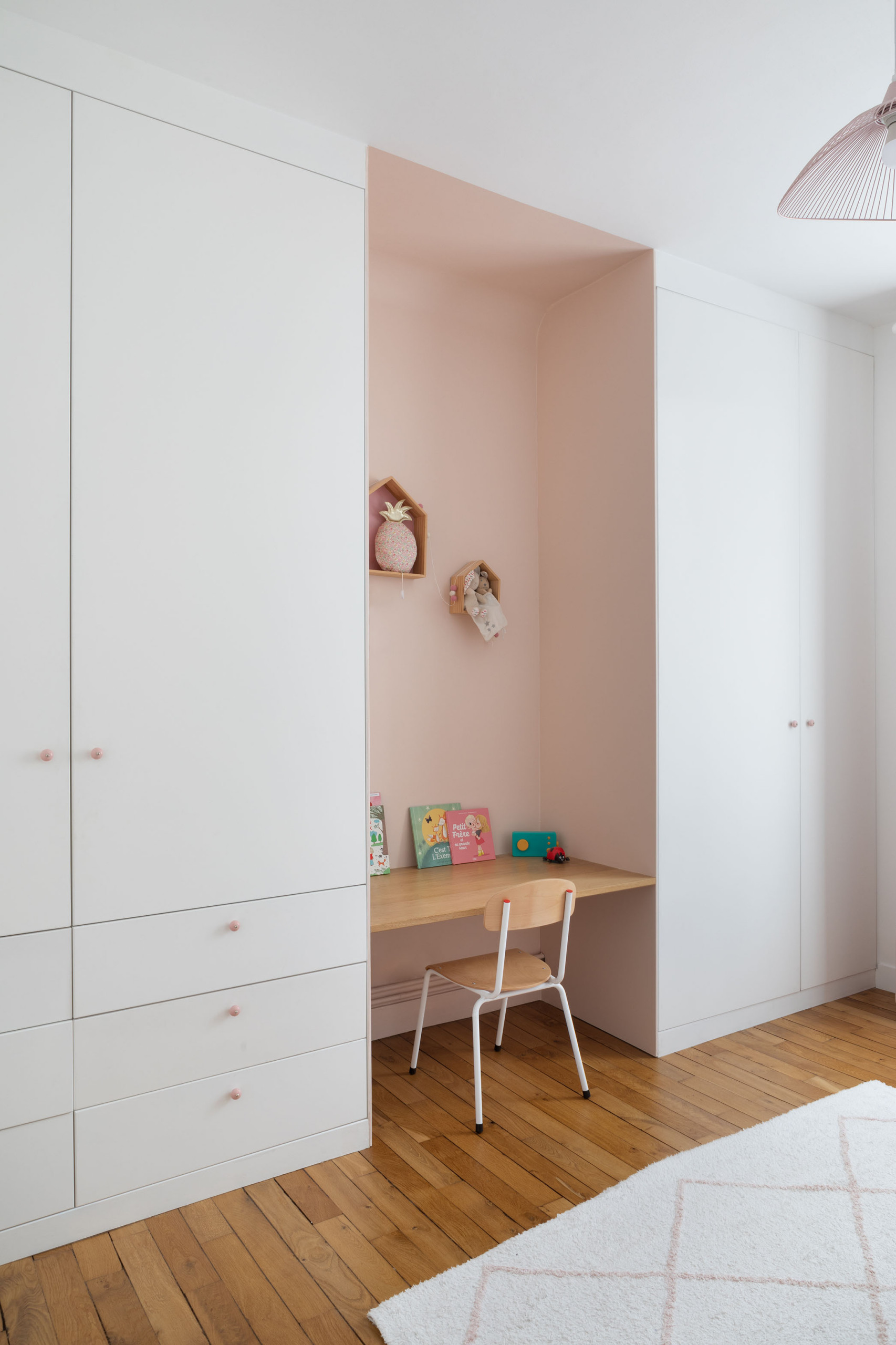Après. Un parquet en chêne réchauffe l’ambiance de cette pièce à l’ambiance sobre et épurée. L’un des murs a été agrémenté de menuiseries sur mesure pour stocker vêtements, livres et jouets sans encombrer l’espace. Au centre, une niche ouverte habillée d’un rose poudré accueille un bureau en bois clair, qui s’accorde avec une petite chaise d’écolier au look rétro.