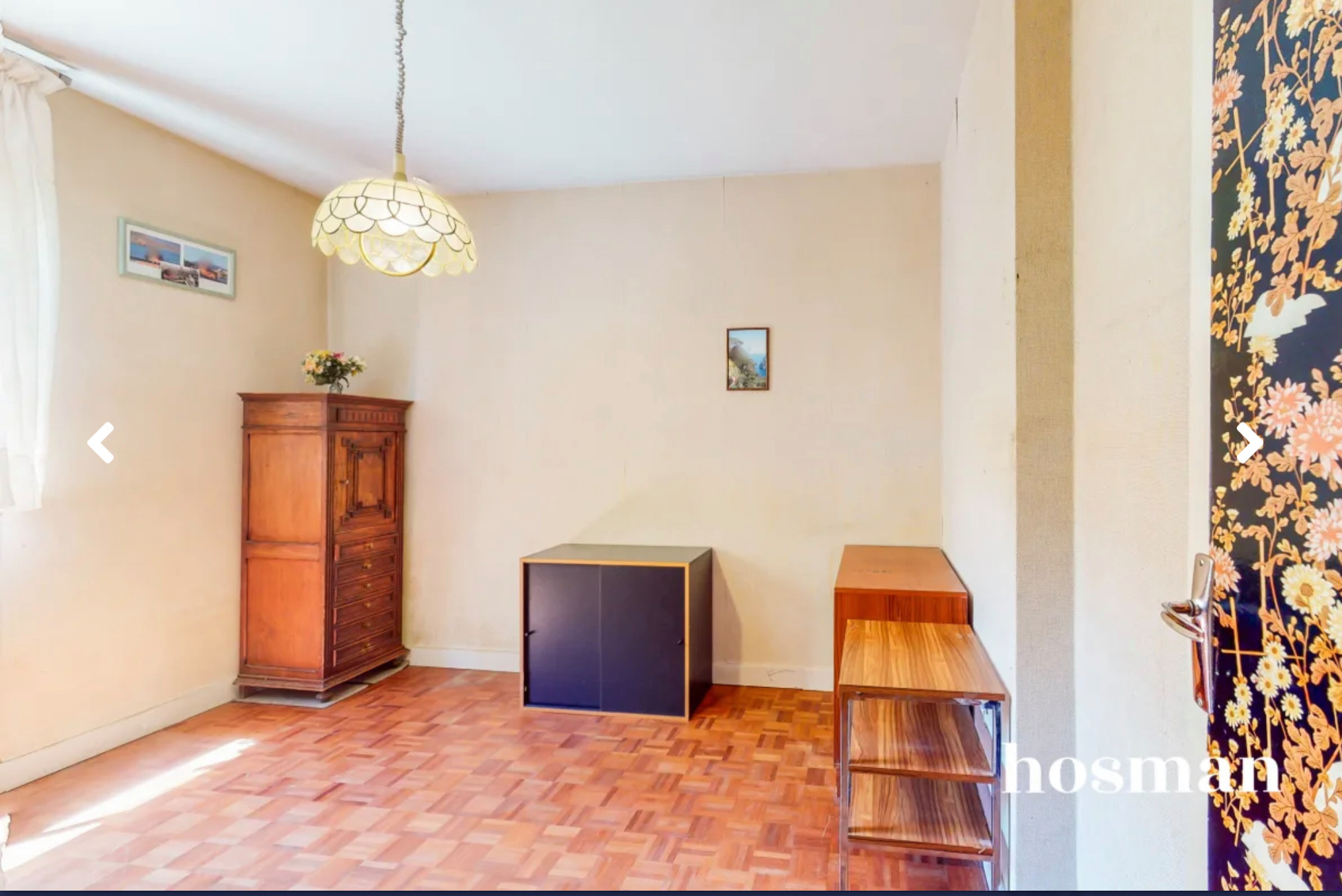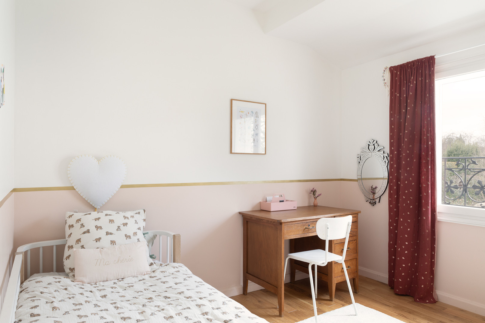 Après. Dans cet espace nimbé de lumière, les propriétaires des lieux ont créé un écrin à l’ambiance intimiste, rehaussé de motifs fleuris et d’un camaïeu de teintes chaleureuses qui s’harmonisent parfaitement avec le parquet en bois massif. Un charmant rose poudré habille le soubassement. Souligné d’un liseré doré, il ajoute une touche sophistiquée à la déco minimaliste de cette pièce. Le coin bureau mêle quant à lui un meuble en bois vintage et une chaise d’écolier modernisée à l’aide d’un blanc éclatant.