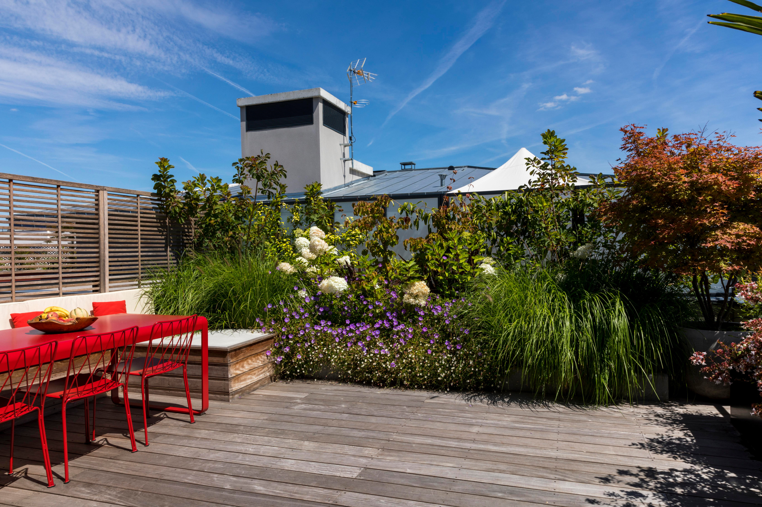 Après. Voici le résultat : ce rooftop autrefois sobre et peu aménagé s’est métamorphosé en un véritable écrin de verdure bardé d’un bois sombre au look rustique. Une végétation luxuriante, mêlant graminées, arbustes et fleurs colorées, entoure un espace de vie convivial. La table rouge vif et ses chaises design apportent une touche moderne et dynamique. Entre nature et élégance, ce toit-terrasse est désormais un lieu chaleureux, idéal pour des repas en plein air et des moments de détente en hauteur.