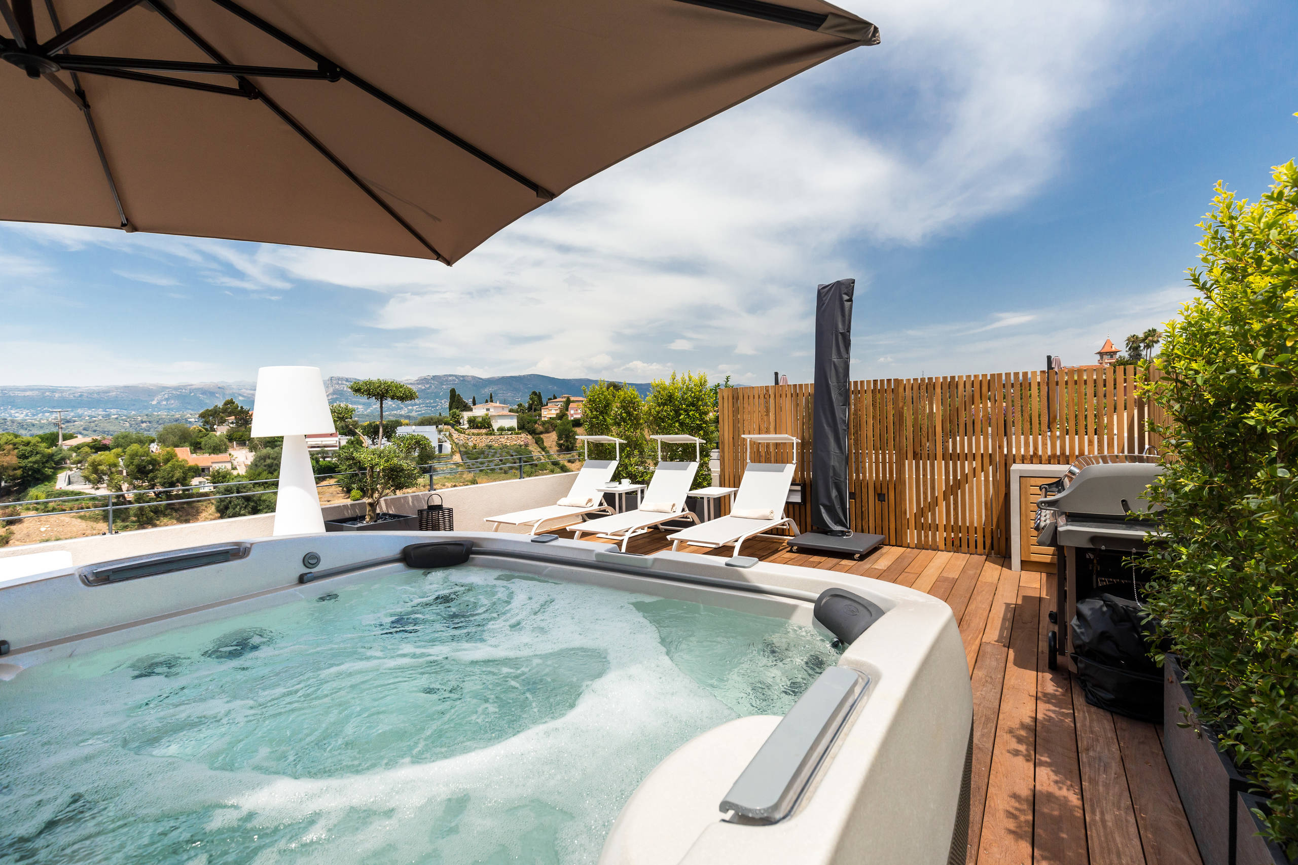 Après. Le rooftop a été entièrement repensé pour devenir un véritable havre de paix. Exit l’espace vide et peu accueillant, place à une ambiance farniente où chaque élément invite à la détente. Un jacuzzi panoramique trône désormais au centre, entouré de transats confortables. Une cuisine extérieure et un brise-vue en bois apportent à la fois intimité et convivialité. L’aménagement soigneusement pensé, entre ombrage et verdure, transforme ce toit en un lieu de bien-être absolu.