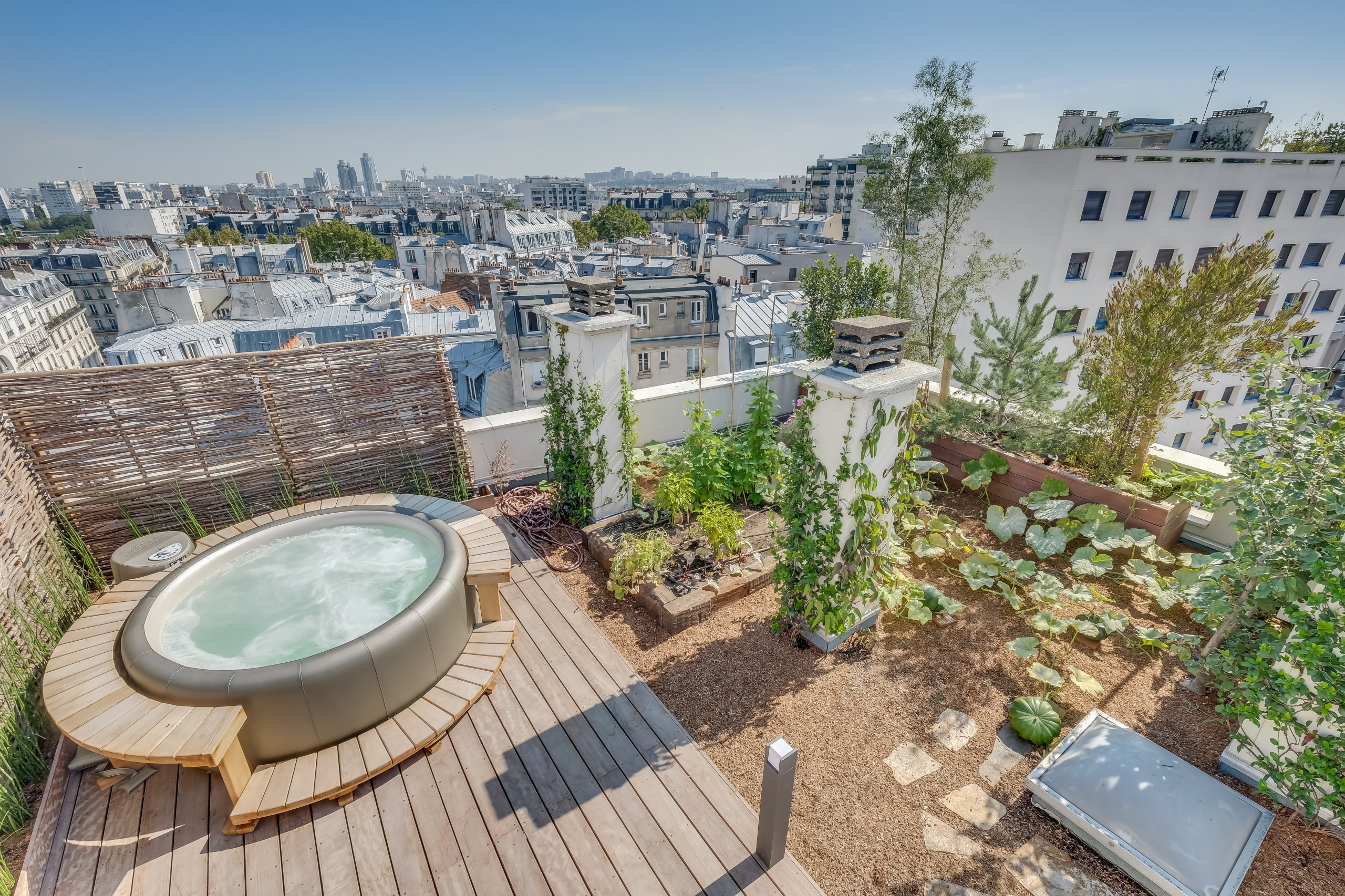 Après. Le rooftop combine astucieusement détente et verdure en plein cœur de la ville. Un bain à remous, entouré d’une banquette en bois, invite à la relaxation, tandis qu’un potager luxuriant transforme l’espace en havre de fraîcheur. La végétation grimpante habille les structures existantes et crée un cocon apaisant, isolant du tumulte urbain. Ce mélange harmonieux entre bien-être et nature optimise l’espace et offre une échappée verte sur les toits.