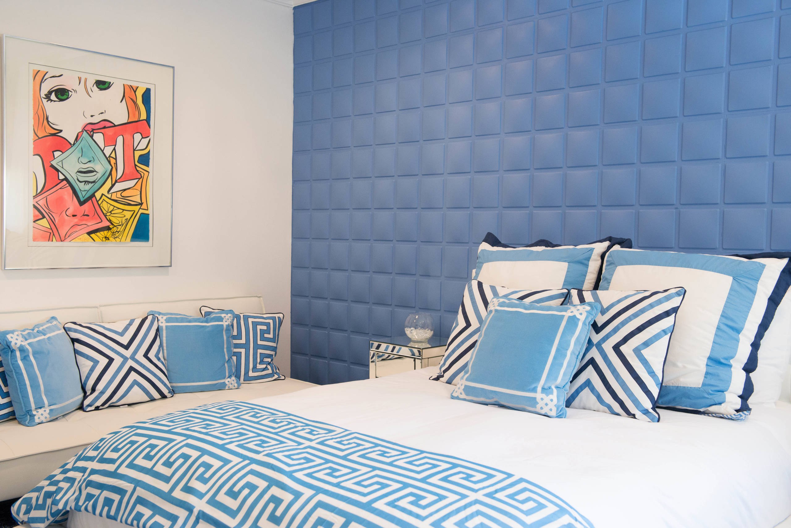 Astuce : Comme ici, aérez le bleu Serenity de motifs blancs ou noirs en formes géométriques.