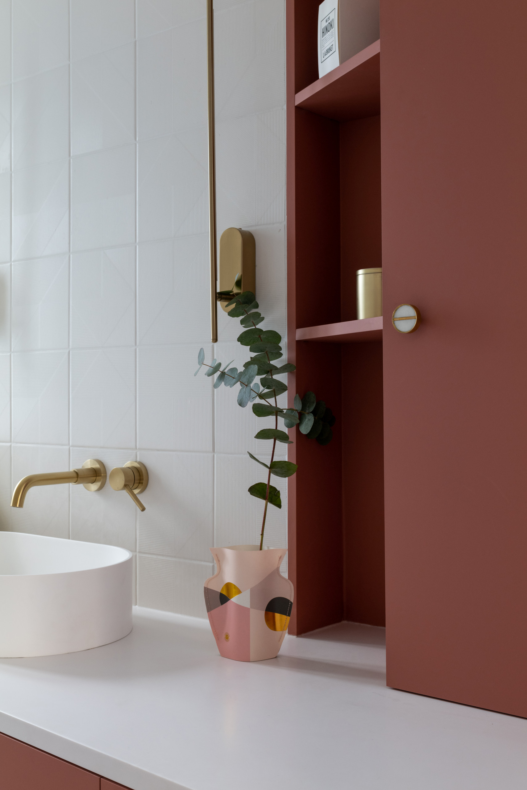 S’il est commun de laisser libre l’espace sur les plans de travail dans les salles de bains, l’agence Lagom architectes a décidé d’en faire autrement dans ce projet. Un placard sur mesure épouse l’angle de la pièce tout en tirant parti d’une niche qu’il aurait été difficile d’aménager autrement. Tout hauteur, il tire le meilleur parti de l’espace et sa teinte rouge contribue à donner du caractère à la décoration.