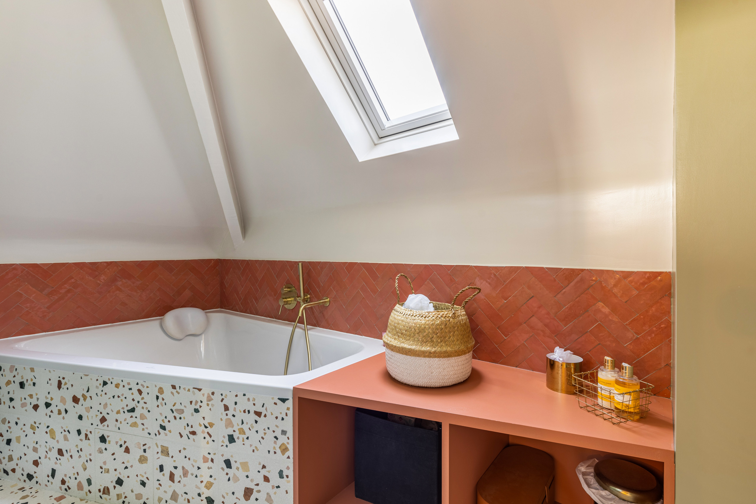 Parfois, la baignoire dans la salle de bains est un luxe dont on ne veut pas se passer, que ce soit pour s’offrir des moments de détente ou pour baigner les plus jeunes. Ici, les architectes d’intérieur de DL Studio sont parvenus à répondre à la demande de leurs clients en optant pour un petit modèle niché sous la pente du toit et prolongé par un meuble sur mesure qui épouse les lignes de la pièce.